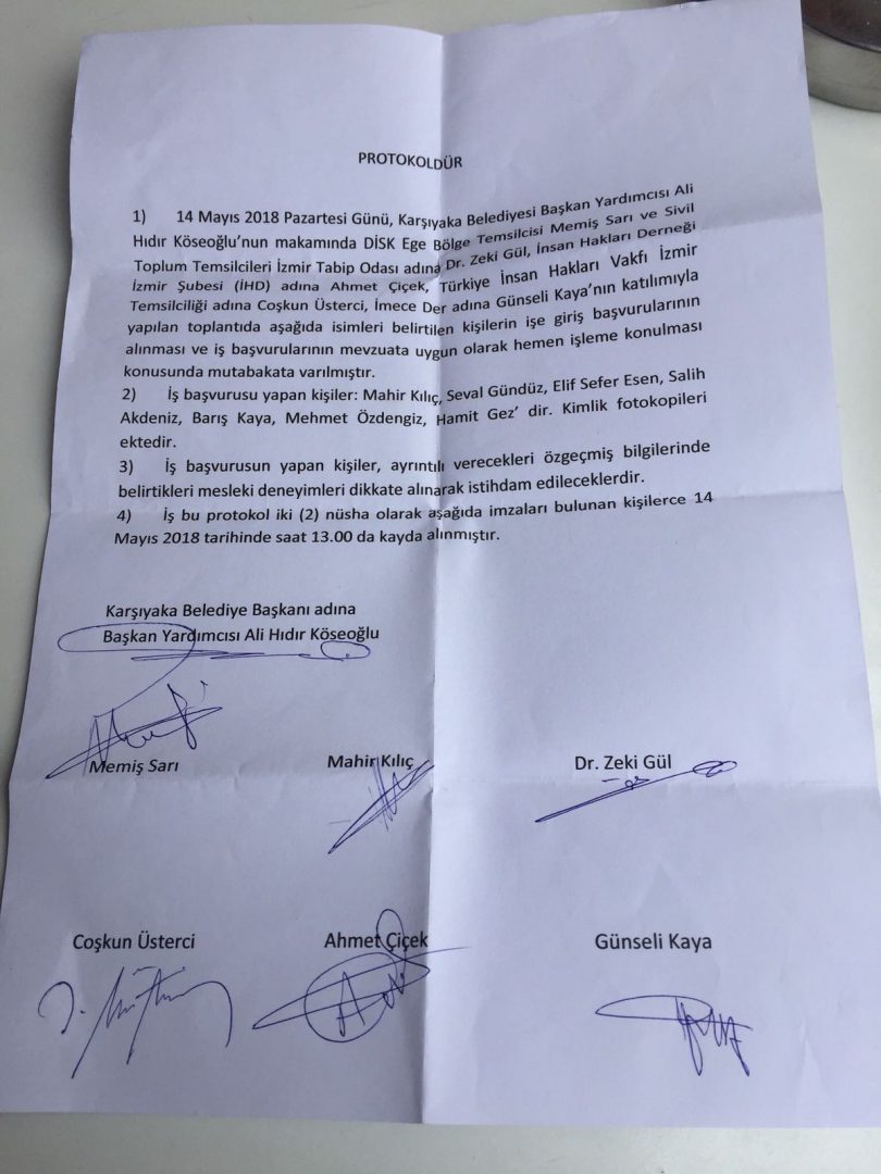 14 Mayıs’ta Karşıyaka Belediye Başkan Yardımcısı Ali Hıdır Köseoğlu, bazı kurumların temsilcileri ve Mahir Kılıç arasında imzalanan protokolde, Kılıç ve diğer direnişçilerin belediyede işe alınma başvurularının derhal işleme konulacağı belirtiliyor.