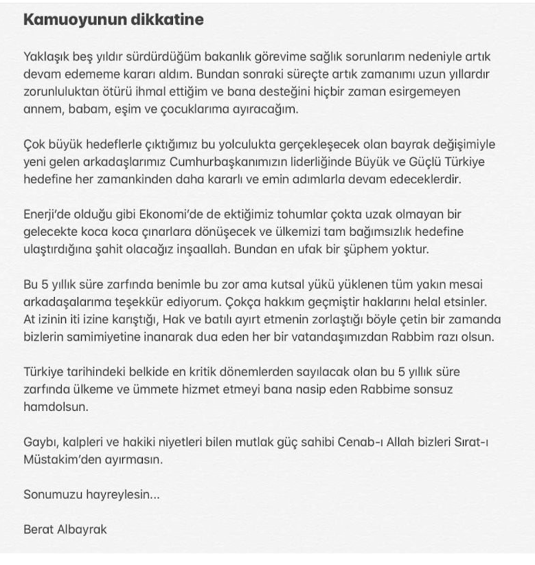 Instagram hesabından bir istifa açıklaması yayınlayan Hazine ve Maliye Bakanı Berat “At izinin it izine karıştığı, Hak ve batılı ayırt etmenin zorlaştığı böyle çetin bir zamanda bizlerin samimiyetine inanarak dua eden her bir vatandaşımızdan rabbim razı olsun” ifadelerine yer verdi. AKP Genel Başkanı ve Cumhurbaşkanı Recep Tayyip Erdoğan’ın ise istifayı kabul edip etmeyeceği ise belirsizliğini koruyor.