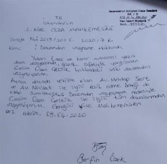 “Ancak gelinen süreçte Berfin’in kendi iradesiyle şikâyetinden vazgeçtiğini bildirmesi üzerine bizler affetmesinin hukuki ve sağlık yönünden sonuçlarını kendisine açıkladık. Buna rağmen kendisi bu iradesinde ısrar ettiği için bizler de ‘’Öldüren sevgi istemiyoruz” şiarımıza ters düştüğünden ilkelerimizden asla taviz vermeyerek, bu saatten sonra Berfin Özek’le ilgili hiç bir çalışmada yer almayacağımızı kamuoyuna bildiriyoruz.”