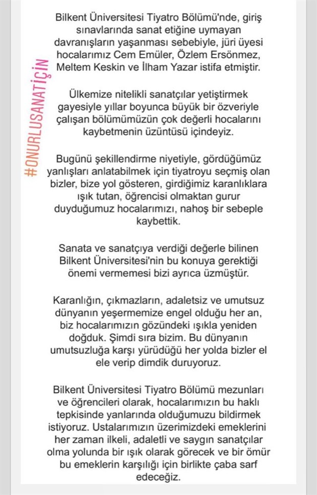 Bilkent Üniversitesi Tiyatro Bölümü giriş sınavları Haziran ayında çok değerli bir jüri tarafından dört gün boyunca yapılmış; sekiz öğrenci bölüme kabul edilmiş; YGS’den baraj puanı almaları halinde bölüme resmi kayıt yaptırabilecekleri hem kendilerine, hem de bütün bölüme sözlü olarak duyurulmuştu. Ancak, sınavın ardından, bölüm başkanı keyfi bir kararla jürinin ilan ettiği listeyi değiştirmiş, listeye iki yeni isim eklemiş ve bu adayları okula kabul ettiğini ilan etmiştir. Sanat okulları eğitim kadrosunda yer alan isimlerin niteliği ve öğrencilerin seviyesi ile değer kazanır. Bunu sağlayan en önemli faktörlerden biri giriş sınavlarının özenli, yetkin ve şaibeden uzak bir şekilde yapılmasıdır. Bilkent Üniversitesi gerçekten çok değerli bir kurumdur ve sanat bölümlerine verdiği destek ile tanınmaktadır. Bilkent Tiyatro Bölümü de, bu güne kadar, hepimizin ortak çabasıyla Türkiye’nin en nitelikli eğitim veren kurumlarından biri olmuştur. Ne var ki, Bilkent gibi güzide bir kurumun titizliğine yakışmayan bu anlaşılmaz tutum, tiyatro bölümünde ders veren bütün meslek dersi hocalarını bir karar vermeye zorlamıştır. Aynı zamanda giriş sınavı jürisini de oluşturan bütün meslek dersi hocaları olarak, şu an itibariyle Bilkent Üniversitesi Tiyatro Bölümü’ndeki eğitmenlik görevimizden ayrılmış bulunmaktayız. Bilgilerinize. ”