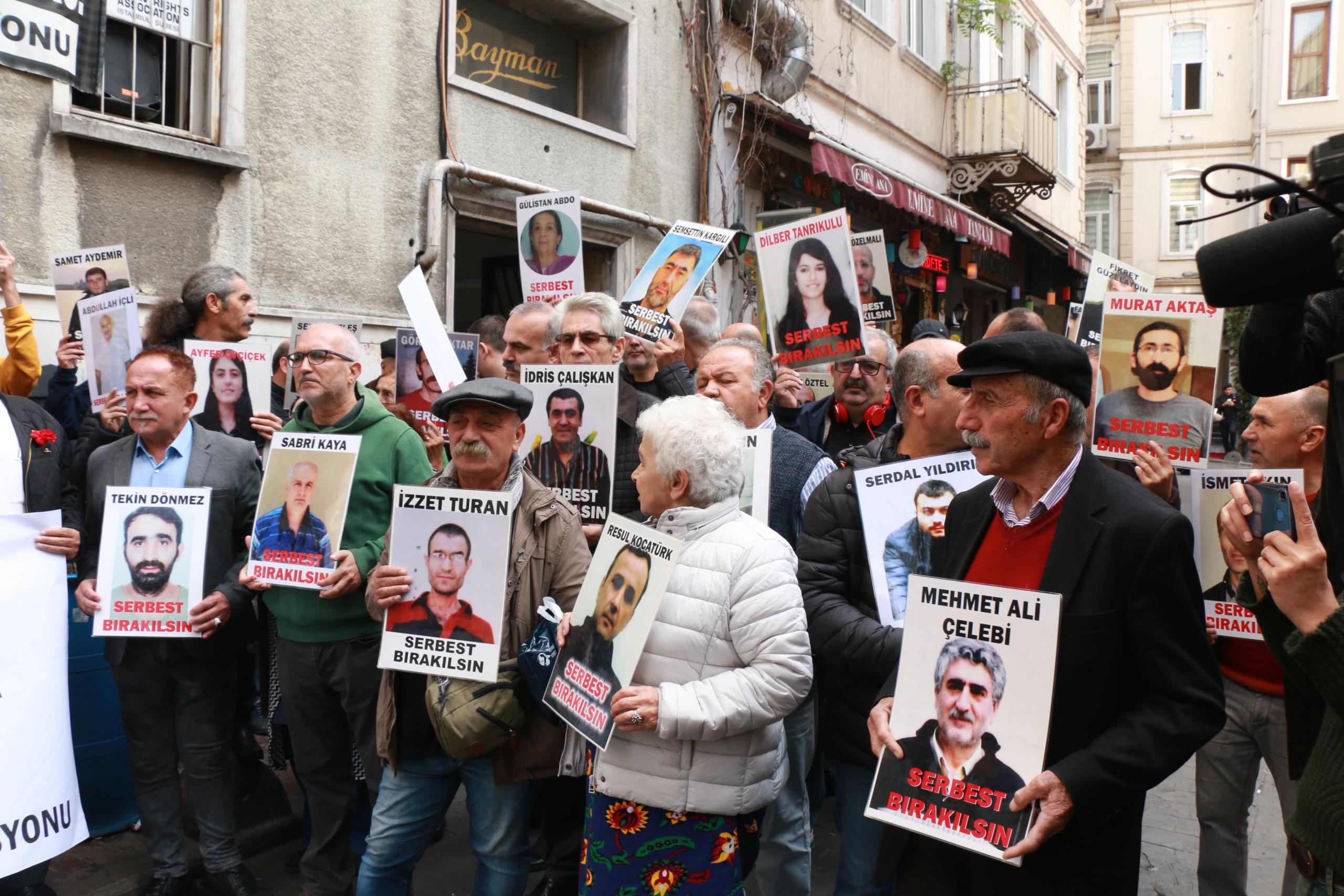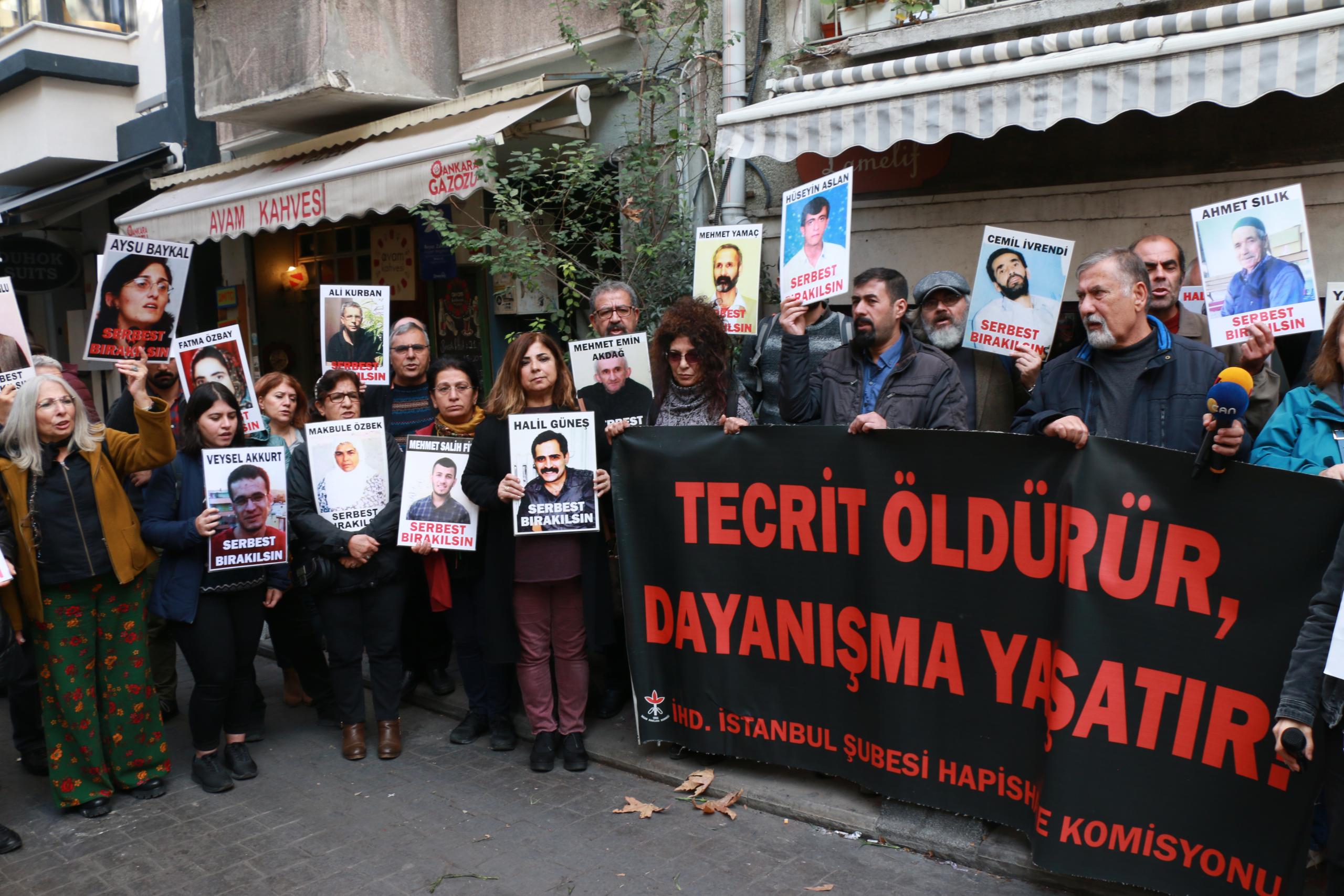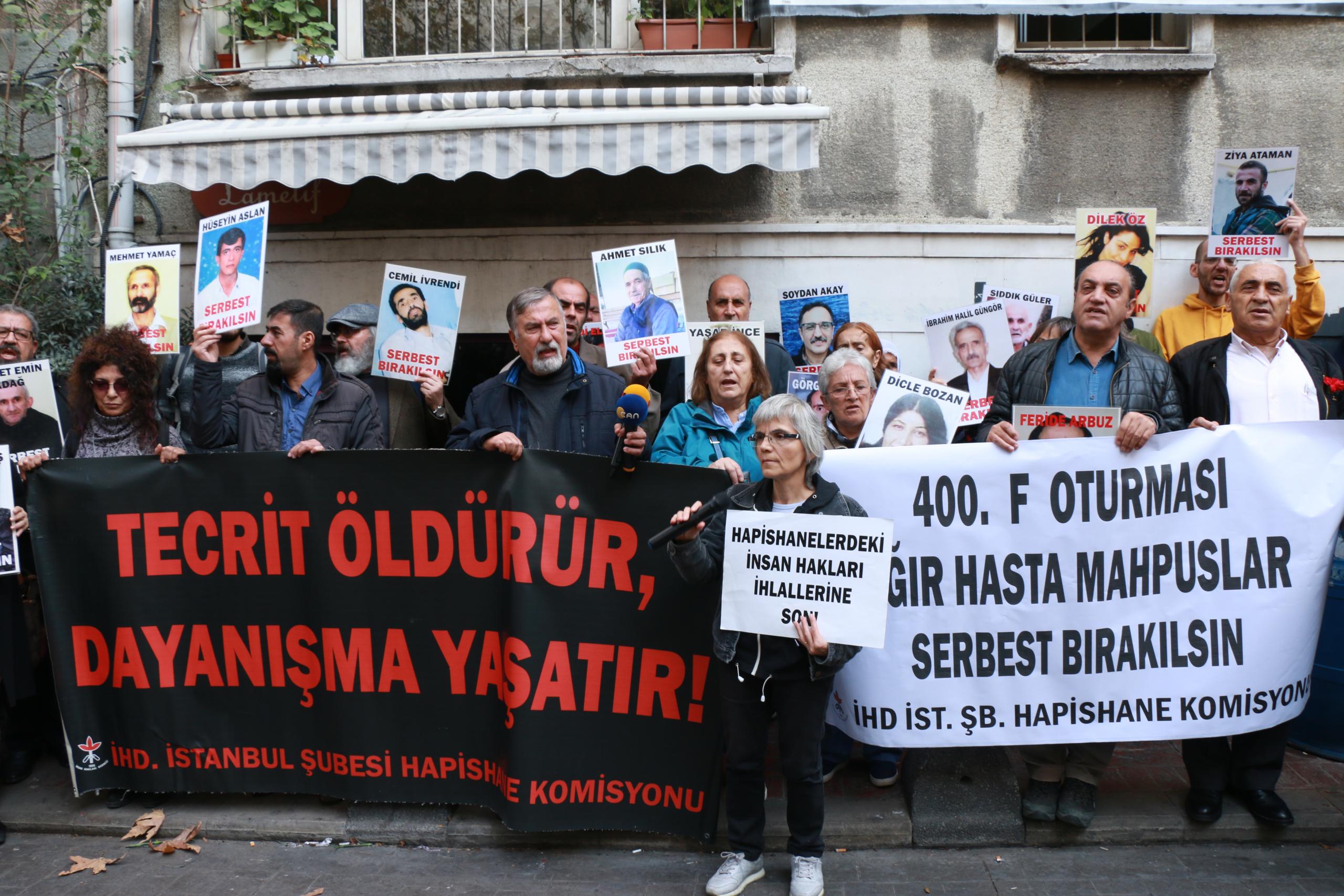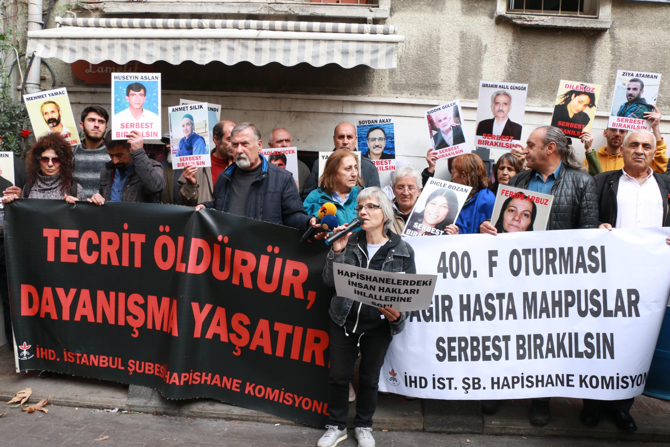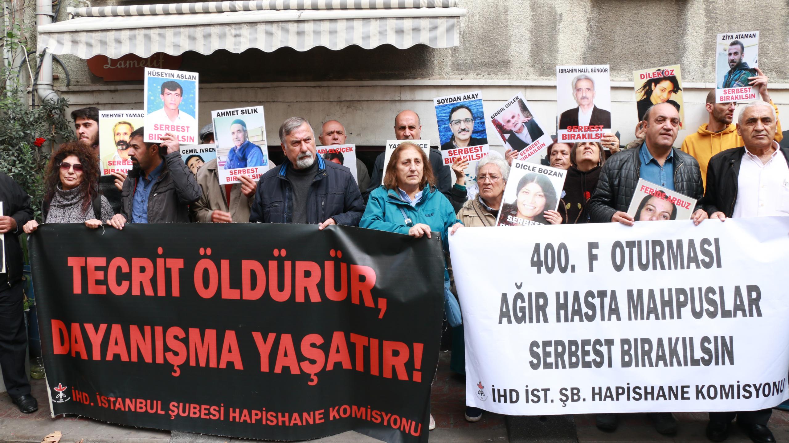 İnsan Hakları Derneği (İHD) İstanbul Şubesi Hapishane Komisyonu’nun hasta tutukluların serbest bırakılması talebiyle Galatasaray Meydanı’nda yapmak istediği ‘F Oturması’nın 400’üncü haftası da polis tarafından engellendi. Bunun üzerine açıklama İHD’nin Taksim’de bulunan binası önünde yapıldı. Hasta tutukluların fotoğraflarının taşındığı eylemde, ‘Tecrit öldürür dayanışma yaşatır’ve ‘Ağır hasta mahpuslar serbest bırakılsın’ pankartları açıldı. Sık sık, ‘Susma suça ortak olma’ ve ‘İnsanlık onuru işkenceyi yenecek’ sloganları atıldı.