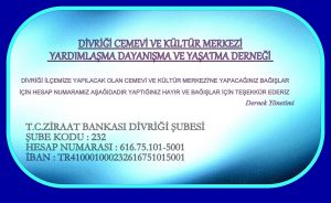 2016 yılında Divriği Cemevi ve Kültür Merkezi Yaptırma Derneği adına satın alınan Cemevi arsasının tüm projeleri onaylanmıştı. İnşaata başlamada hiçbir yasal sorun bulunmayan Divriği Cemevi ve Kültür Merkezi yapım için destek bekliyor.