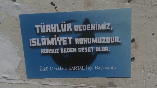 - Bursa’da Kestel Cemevi duvarlarına yapılan ırkçı yazılamanın ardından İstanbul’da Pir Sultan Abdal Kültür Derneği Kartal Cemevi duvarına Ülkü Ocakları Kartal İlçe Başkanlığı imzasıyla “Türklük bedenimiz, İslamiyet ruhumuzdur, ruhsuz beden ceset olur” yazılı afiş yapıştırıldı.