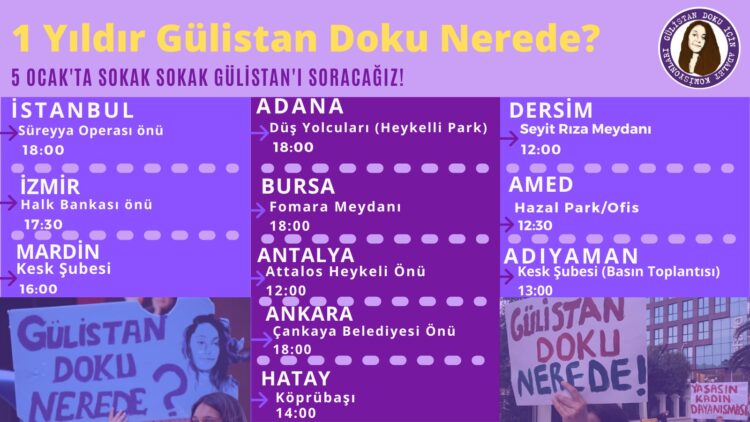 21 yaşındaki Gülistan’ın kaybolmasıyla ilgili soruşturma devam etse de, Doku ailesi ve kadın hakları savunucuları arama çalışmalarının yetersiz ve eksik yapıldığı yönünde eleştirilerini sürdürüyor. Tam bir yıldır bulunamayan Gülistan Doku için 5 Ocak’ta çeşitli kentlerde Gülistan Doku için Adalet Komisyonları öncülüğünde 11 ilde eylem gerçekleştirilecek.