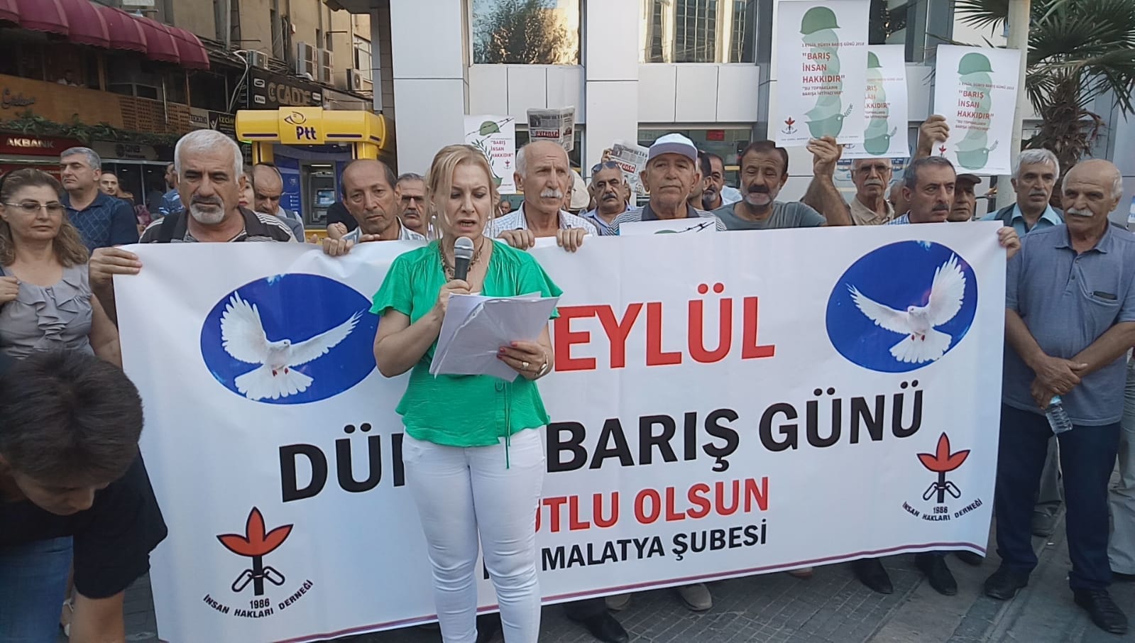 Yapılan basın açıklamasını okuyan İHD Malatya şube başkanı Gönül Öztürkoğlu, “Kalıcı barış için çatışma nedenleri ortadan kaldırılmalıdır. Bunun için ilk yapılması gereken çatışmaların durması, sona erdirilmesi, diyalog yollarının açık tutulması, insan hakları ve demokrasi eksenli çözüm arayışlarına imkan sağlanmasıdır. Türkiye’nin yönetim sisteminin otoriterleştiği koşulların ortadan kaldırılarak demokrasi ve insan haklarına dayalı yeni bir toplum sözleşmesi barıştan ve barışı savunmaktan geçmektedir. İHD olarak, ülkemiz başta olmak üzere tüm dünyada barışın egemen olduğu bir yaşam için insan hakları mücadelemizi sürdüreceğiz” diye konuştu.