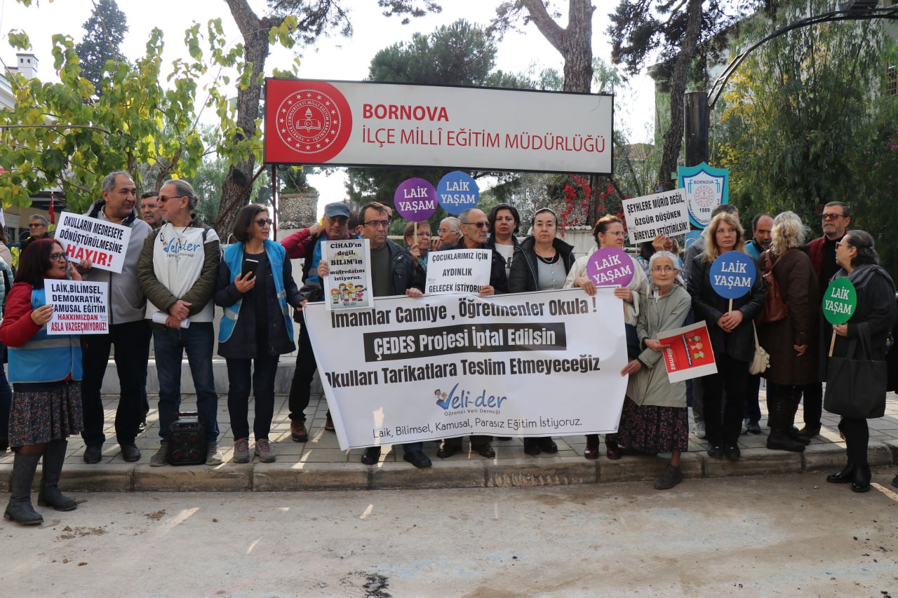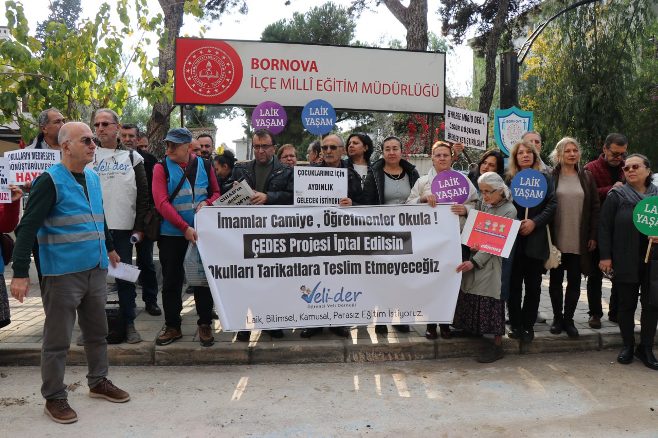 Öğrenci Veli Derneği (Veli-Der) İzmir 2 Nolu Şube, Bornova’da 99 okula ÇEDES protokolü kapsamında atanan imamları protesto etmek amacıyla Bornova İlçe Milli Eğitim Müdürlüğü önünde basın açıklaması yaptı.