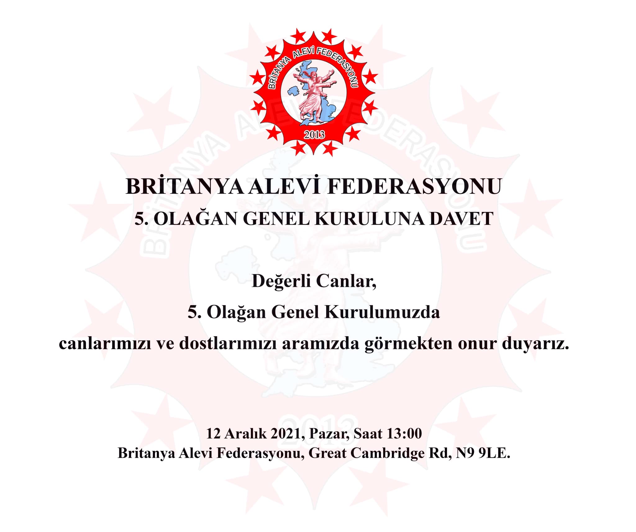 12 Aralık 2021 Pazar günü Britanya Alevi Federasyonu yerleşkesinde gerçekleşecek kurul saat 13.00’te başlayacak.