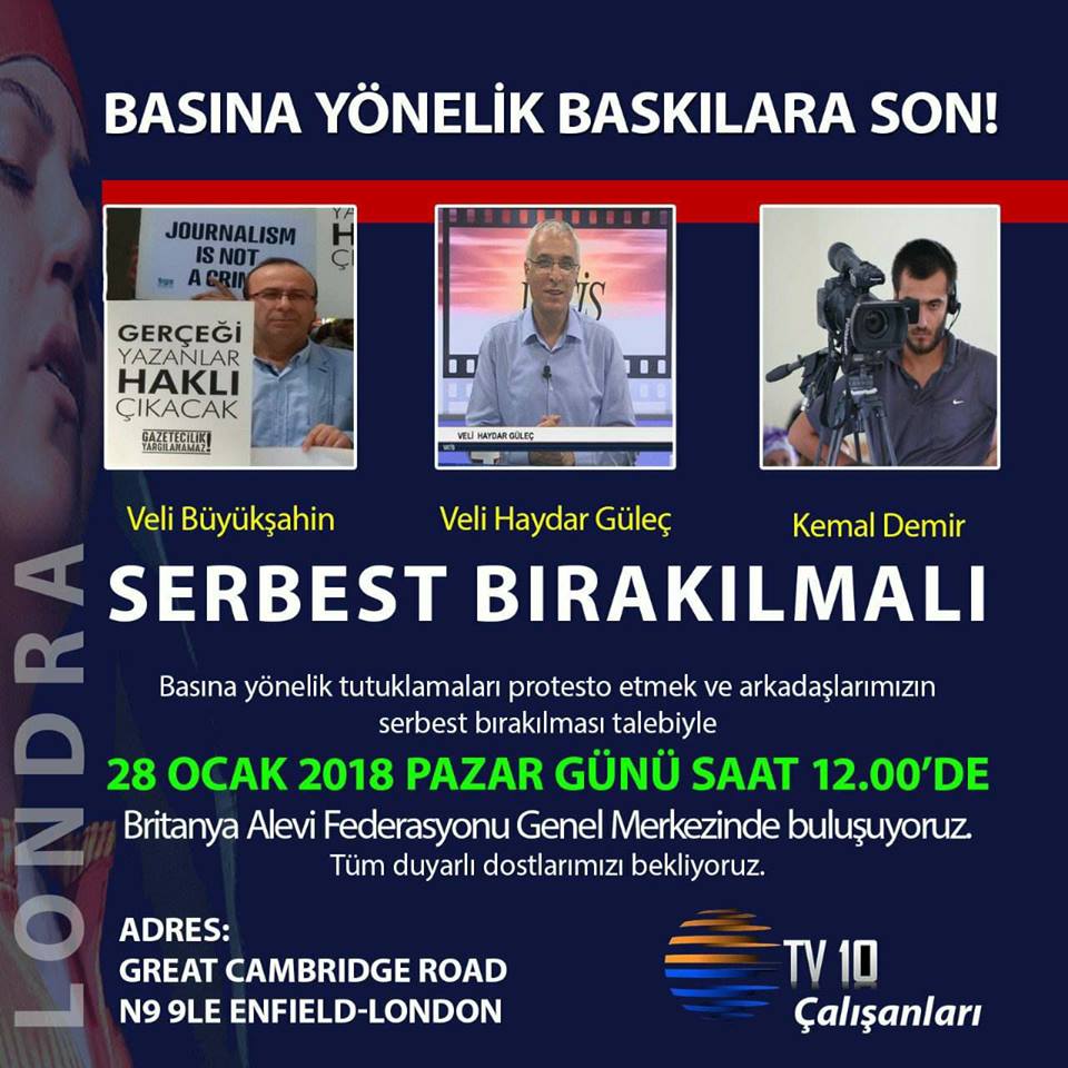 Basına yönelik baskılara son verilmesini isteyen Londra’daki TV10 çalışanları tutuklu meslektaşlarının serbest bırakılmasını talep ediyor. TV10 Yönetim Kurulu Başkanı Veli Büyükşahin, TV10 Programcısı Veli Haydar Güleç ve TV10 kameramanı Kemal Demir’in serbest bırakılması için bir araya gelen Londra’daki TV10 çalışanları tüm duyarlı kesimlere de çağrı yapılan açıklamada, “Basına yönelik tutuklamaları protesto etmek ve arkadaşlarımızın serbest bırakılması talebiyle 28 Ocak 2018 Pazar Günü Saat 12.00’de Britanya Alevi Federasyonu Genel Merkezi’nde buluşuyoruz” dedi. (HABER MERKEZİ)