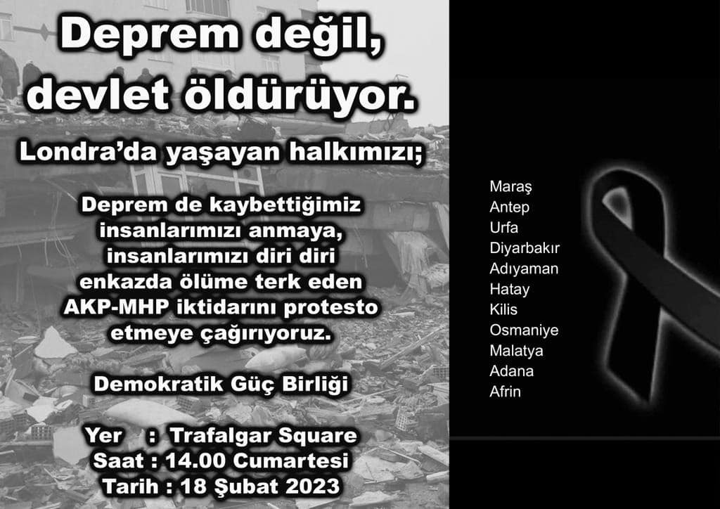 PİRHA-Britanya Demokratik Güç Birliği depremlerin ardından bugün Londra’da “Deprem değil, devlet öldürüyor” diyerek protesto eylemi düzenleyecek.