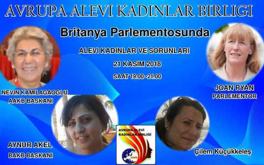 Avrupa Alevi Kadınlar Birliği (AAKB), Britanya Parlamentosu Alevi Sekreteryası tarafından 21 Kasım Çarşamba günü Britanya Parlamentosu’nda “Alevi Kadınlar ve Sorunları” başlığı ile bir oturum düzenlenecek.