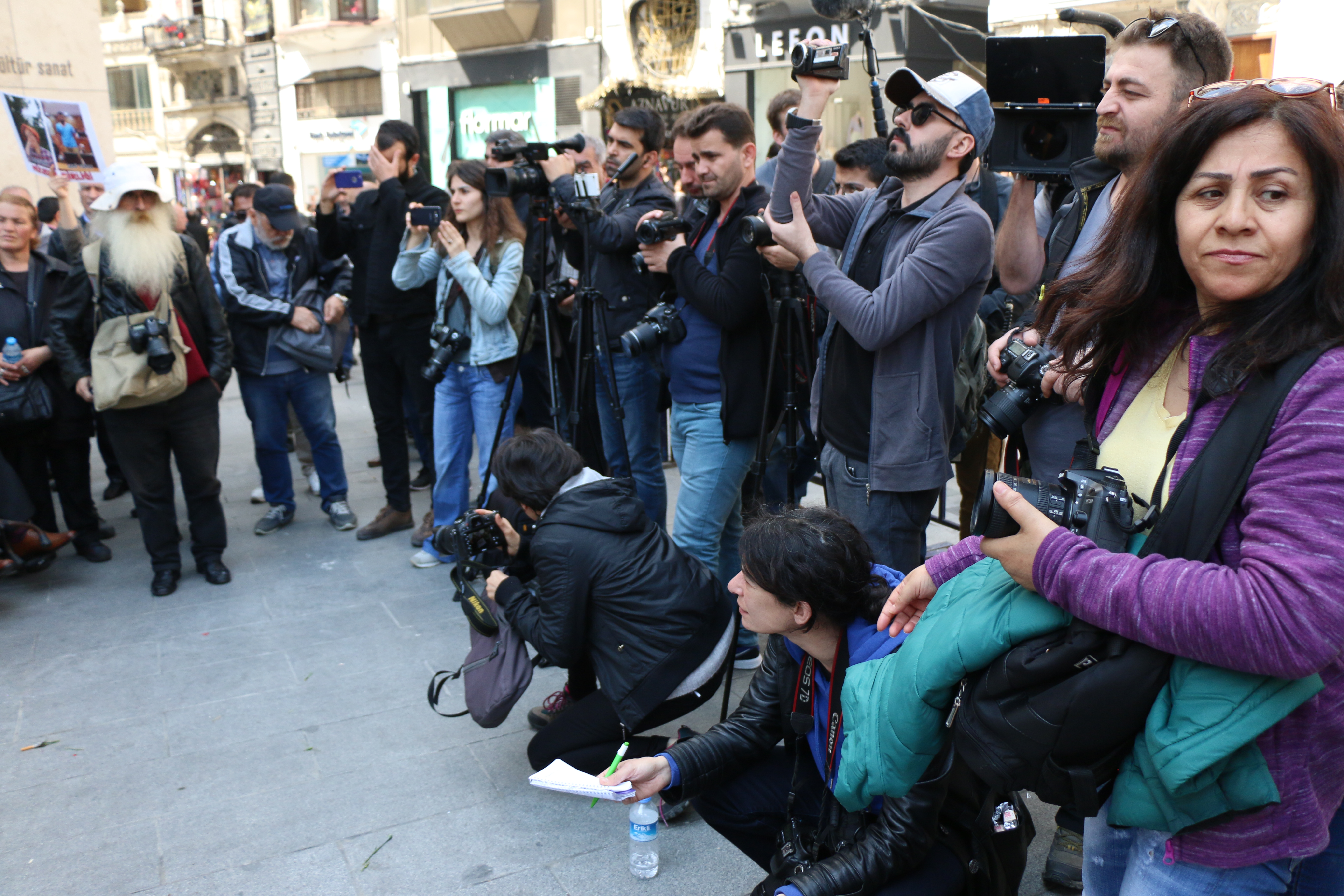Gazeteciler bu defa İstanbul Galatasaray Meydanı’nda Cumartesi Annelerinin eylemi takip ettikten sonra kamera ve fotoğraflarını bırakıp açıklama alanında yerini aldı. Tutuklanan meslektaşları için bir araya gelen gazeteciler, “Tek tipleştirmek istediğiniz gazeteciler olmayacağız” dedi.