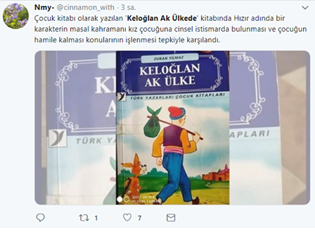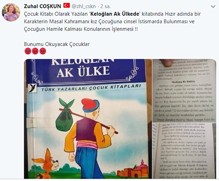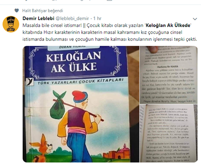 Çocuk kitabı olarak yazılan ‘Keloğlan Ak Ülkede’ kitabında Hızır adında bir karakterin masal kahramanı kız çocuğuna cinsel istismarda bulunması ve çocuğun hamile kalması konusu işleniyor.