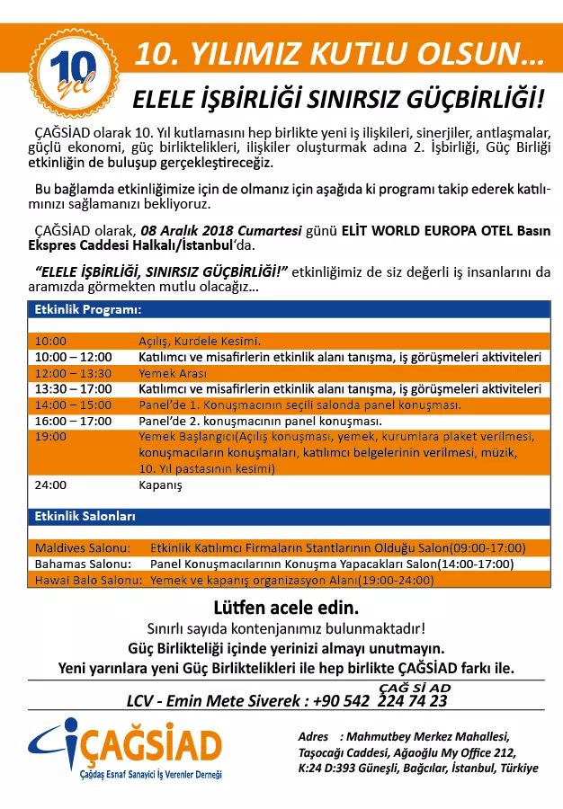 PİRHA-ÇAĞSİAD 10’ncu yıl gala yemeği ve 2’nci işbirliği güçbirliği etkinliği düzenliyor. 8 Aralık 2018 günü Elite Worl Europa otelde gerçekleşecek etkinliğe dair çağrıda bulunan ÇAĞSİAD, yaşanmakta olan büyük küresel krizin ülkeyi ve özellikle küçük-orta işletmeleri kasıp kavurarak neredeyse tamamını tehdit ettiğini belirterek duyarlı esnaf ve tüm iş insanlarını bir çatı altında buluşmaya davet etti.