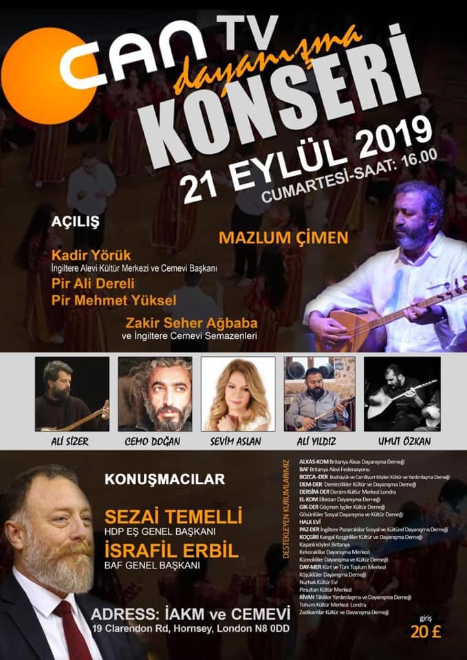 İngiltere Alevi Kültür Merkezi (İAKM) Londra Cemevinde Can TV ile dayanışma konseri düzenlenecek. 21 Eylül Cumartesi günü saat 16.00’da başlayacak dayanışma gecesine konuşmacı olarak HDP Eş Genel Başkanı Sezai Temelli ve Britanya Alevi Federasyonu (BAF) Başkanı İsrafil Erbil katılacak.