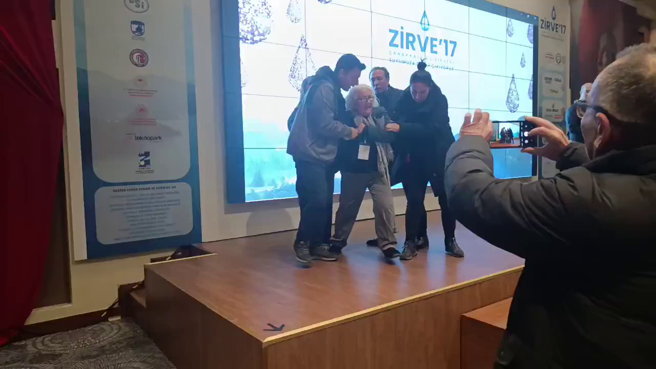Çanakkale’de altın madencilerinin sponsorluğunda yapılan Su Zirvesi’ni protesto eden Kazdağları Ekoloji Platformu Sözcüsü Süheyla Doğan yaka paça salondan dışarı atıldı.
