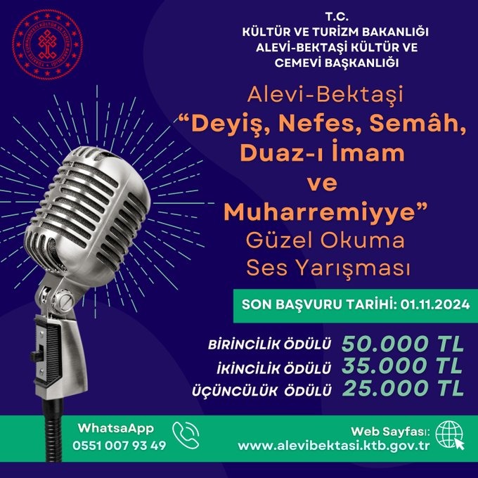 Alevi Bektaşi Kültür ve Cemevi Başkanlığı, ‘Alevi-Bektaşi Deyiş, Nefes, Semah, Duaz-ı İmam ve Muharremiyye Güzel Okuma Ses Yarışmasında’ birinciye 50 bin TL, ikinciye 35 bin TL, üçüncüye 25 bin TL, jüri özel ödülü 20 bin TL, mansiyon ödülü (3 adet) olarak ise 15 bin TL verileceğini belirtti.