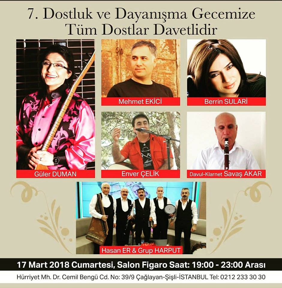 Saat: 19.00’da başlayacak geceye Güler Duman, Mehmet Ekici, Berrin Sulari, Enver Çelik, Davul-Klarneti ile Savaş Akar ve Hasan Er&Grup Harput katılacak.