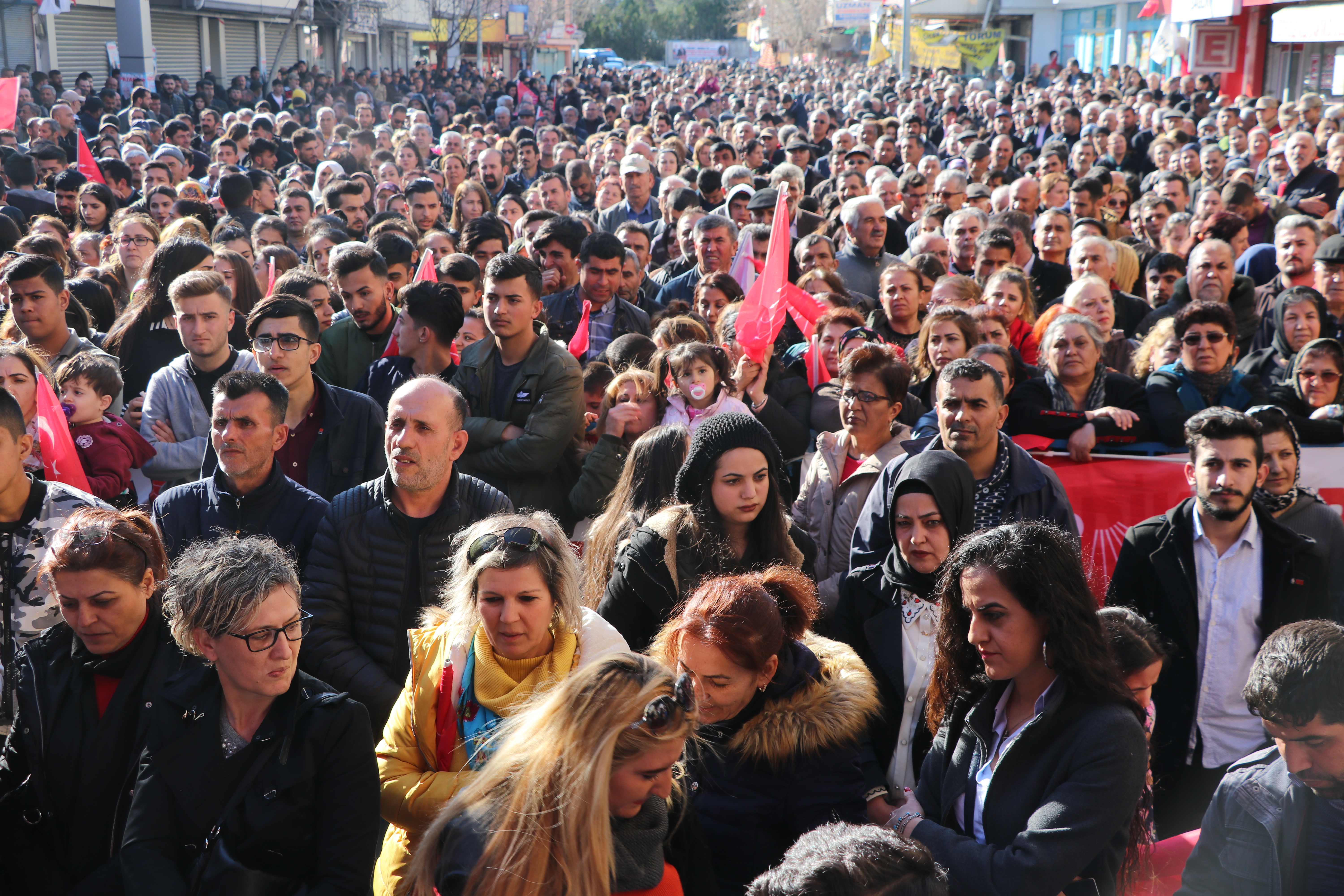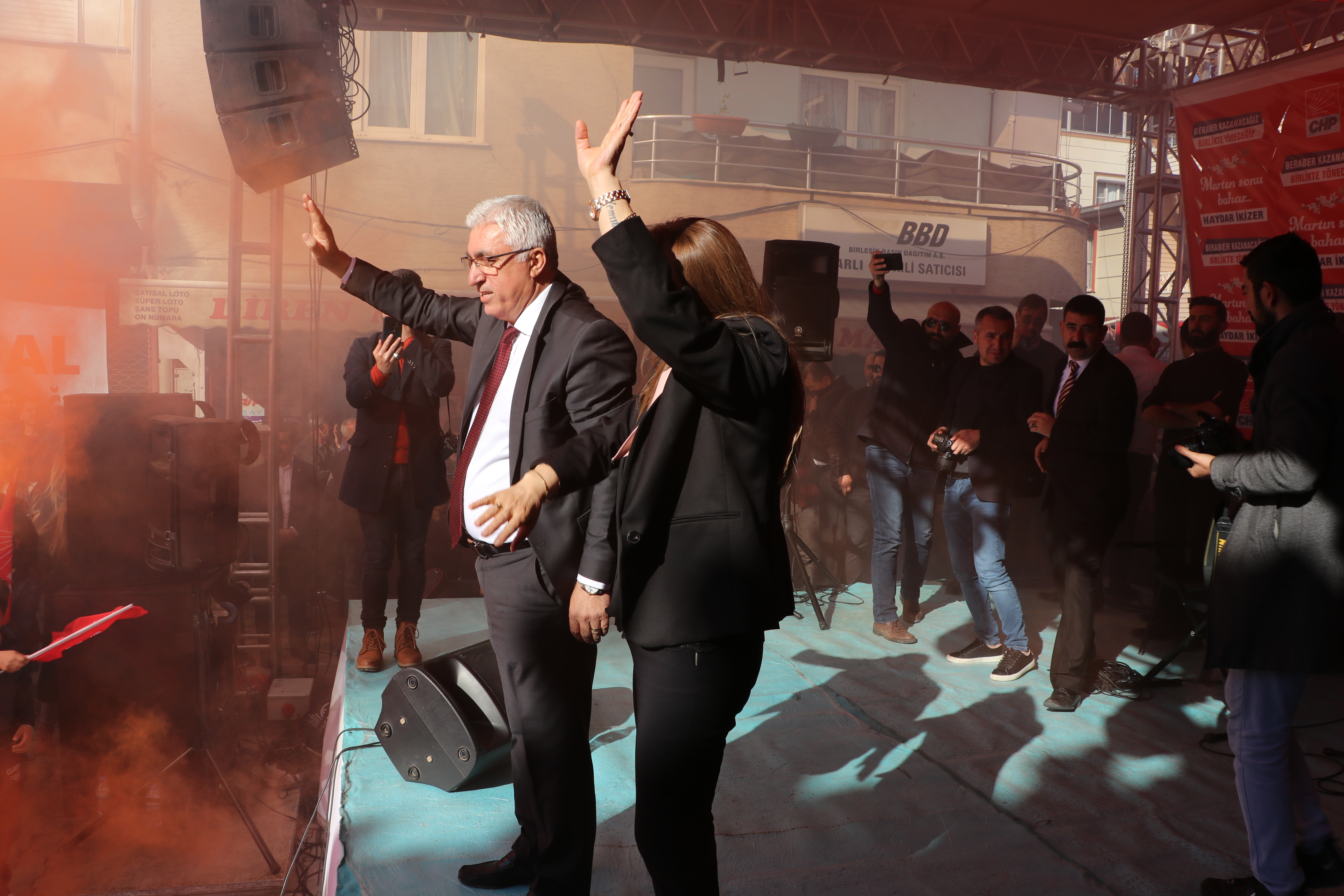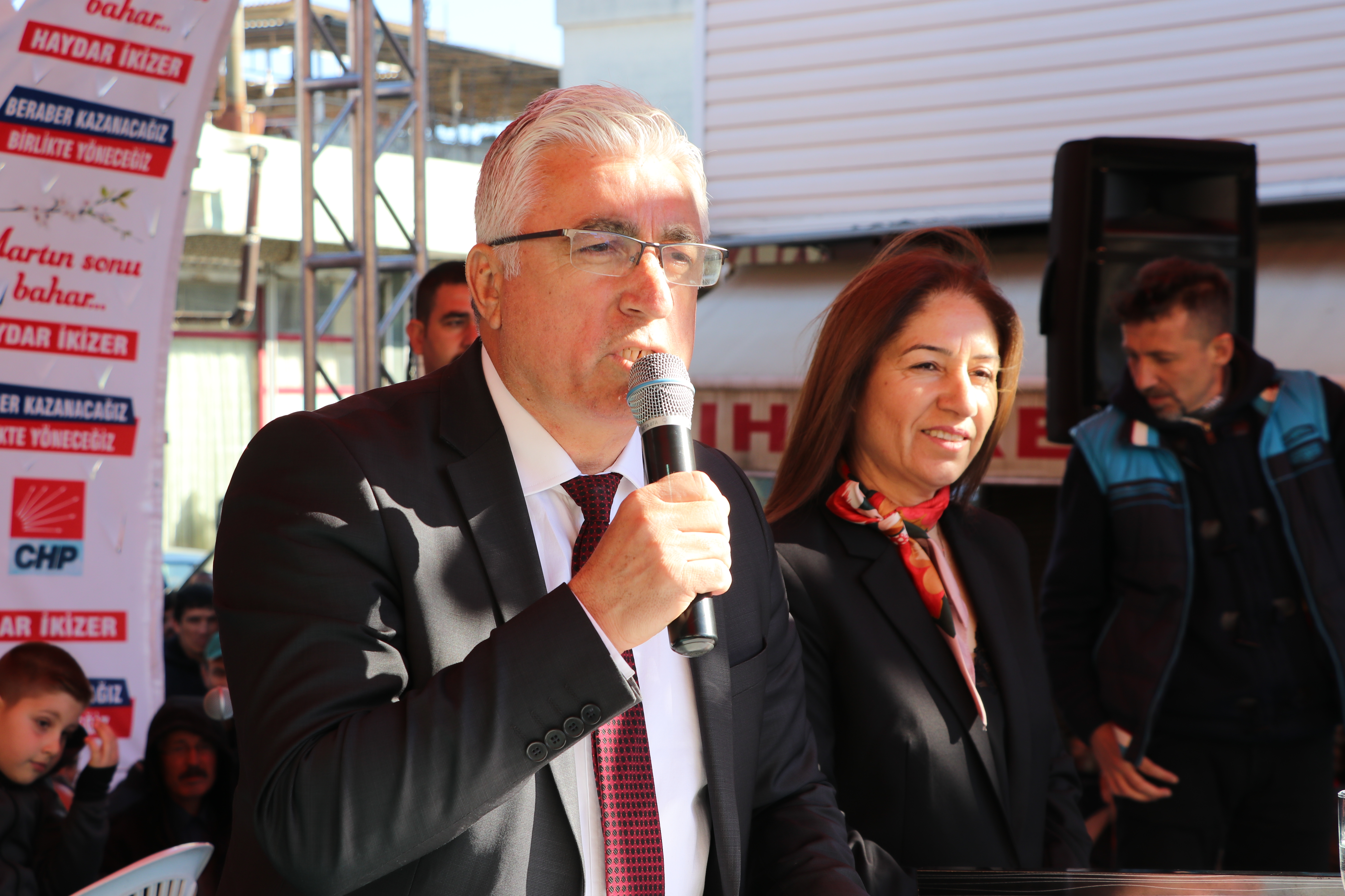 CHP Pazarcık Belediye Başkan Adayı Haydar İkizer’in anons edilmesi ile birlikte alanda bulunan binlerce kişi “Başkan İkizer”, “Dik dur eğilme Narlı seninle” ve “Meydanlar bize dar yürü be Haydar” sloganları atarak destek verdiler.