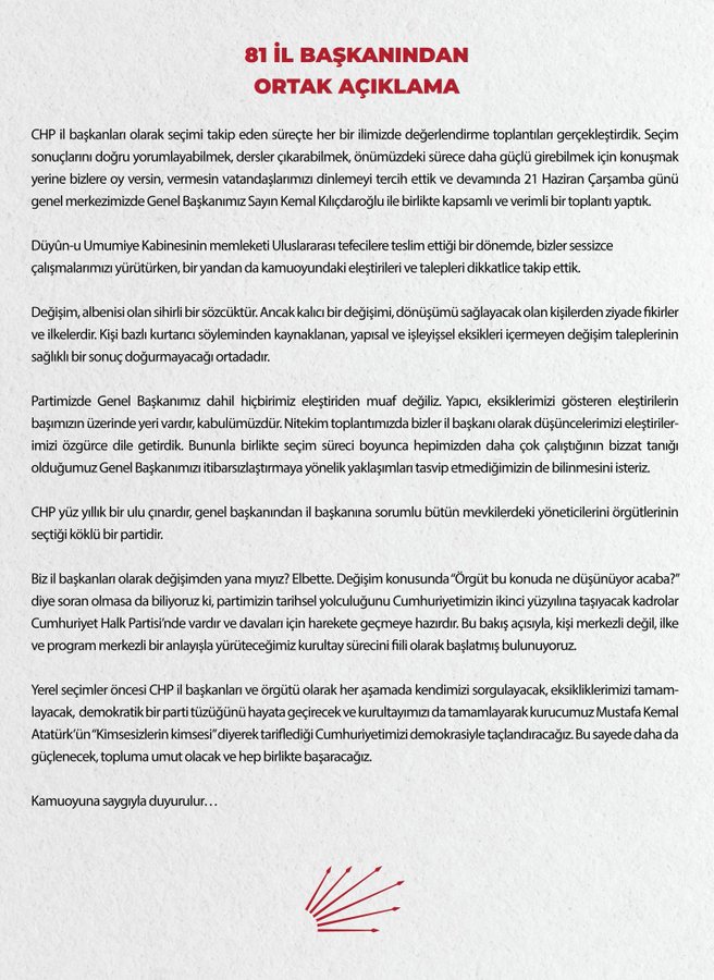 Cumhuriyet Halk Partisi (CHP) Genel Başkanı Kemal Kılıçdaroğlu’nun, 2023 Mayıs ayı seçimlerinde kaybetmesinin ardından parti içerisinde ‘değişim’ ve ‘liderlik’ tartışmaları devam ederken CHP’nin 81 il başkanı ortak bir açıklama yayımladı.