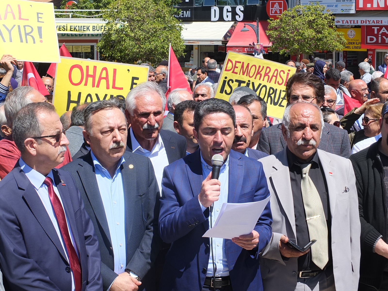 Yapılan basın açıklamasını okuyan CHP Merkez İlçe Başkanı Hanifi Çavuş, “OHAL adı altında gidilen referandum meşruiyeti olamayan bir rejim değişikliğini ülkemize dayatmıştır. Sivil darbe ortamında ‘Evet’ demenin devletin tüm kurumlarıyla desteklendiği ‘Hayır’ demenin ise adeta yasaklandığı bir dönem yaşanmıştır” diyen Çavuş şunları kaydetti: