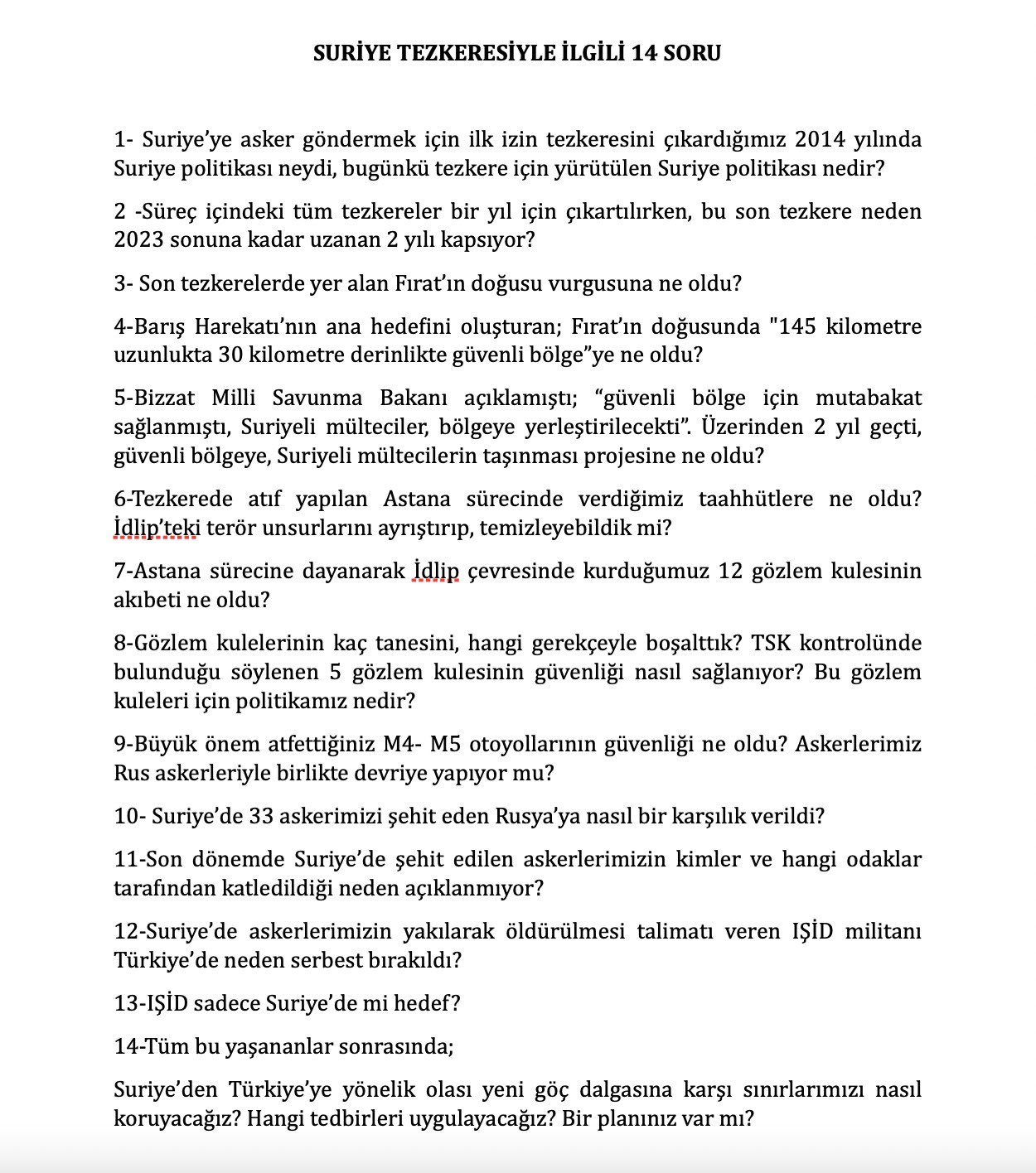 “1- Suriye’ye asker göndermek için ilk izin tezkeresini çıkardığımız 2014 yılında Suriye politikası neydi, bugünkü tezkere için yürütülen Suriye politikası nedir?
