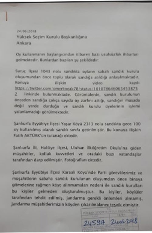Şanlıurfa başta olmak üzere bir çok ilde yaşanan toplu oy kullanma ve müşahitlere saldırı olayları üzerine CHP, Yüksek Seçim Kurulu’na (YSK) başvurdu.Alınan bilgiye göre, CHP’nin dilekçesinde, müşahitlerin köylere sokulmaması ve toplu oy kullanımı olaylarına karşı YSK’nin önlem alması istendi. CHP’nin Urfa’da yaşananlar konusunda YSK’ye 4 ayrı başvuru yaptığı öğrenildi. CHP tarafından YSK’ye yapılan başvuru sayısının 10 olduğu ifade edildi. CHP’liler, Urfa’nın Eyyübiye ilçesinde henüz oy kullanma saati başlamadan bir sandıkta kullanılmış 100 oy tespit etti.