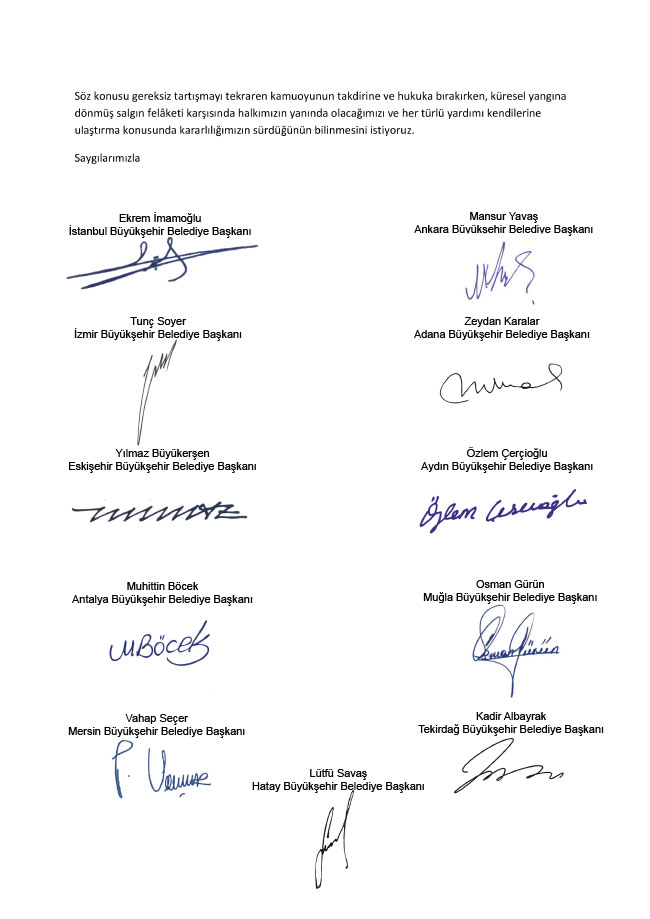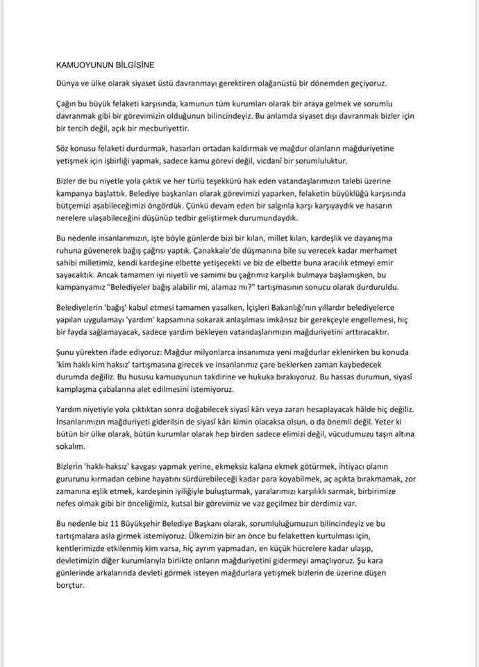 Açıklamada, “Dünya ve ülke olarak siyaset üstü davranmayı gerektiren olağanüstü bir dönemden geçiyoruz. Çağın bu büyük felaketi karşısında, kamunun tüm kurumlan olarak bir araya gelmek ve sorumlu davranmak gibi bir görevimizin olduğunun bilincindeyiz. Bu anlamda siyaset dışı davranmak bizler için bir tercih değil, açık bir mecburiyettir. Söz konusu felaketi durdurmak, hasarları ortadan kaldırmak ve mağdur olanların mağduriyetine yetişmek için işbirliği yapmak, sadece kamu görevi değil, vicdani bir sorumluluktur. Bizler de bu niyetle yola çıktık ve her türlü teşekkürü hak eden vatandaşlarımızın talebi üzerine kampanya başlattık. Belediye başkanları olarak görevimizi yaparken, felaketin büyüklüğü karşısında bütçemizi aşabileceğimizi öngördük. Çünkü devam eden bir salgınla karşı karşıyaydık ve hasarın nerelere ulaşabileceğini düşünüp tedbir geliştirmek durumundaydık” ifadeleri yer aldı.