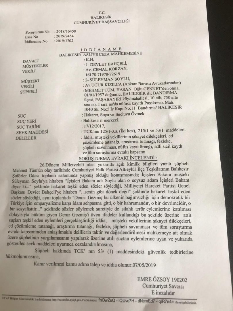 CHP Balıkesir Milletvekili Mehmet Tüm hakkında, MHP Genel Başkanı Devlet Bahçeli ile İçişleri Bakanı Süleyman Soylu’ya hakaret ettiği iddiasıyla ve Deniz Gezmiş’i övdüğü gerekçesiyle açılan soruşturma kapsamında savcılık iddianamesi hazırlandı.