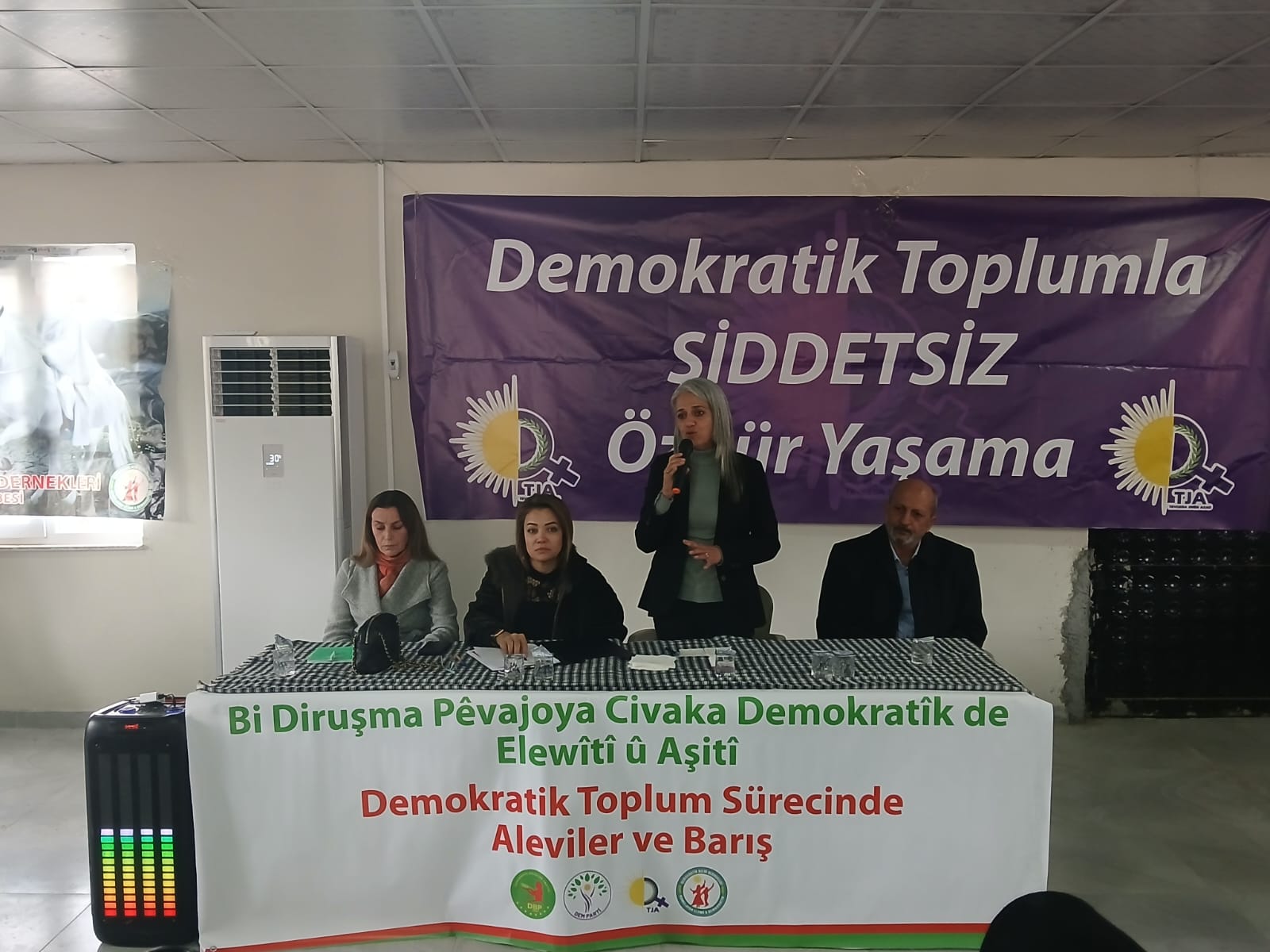 ‘Demokratik Toplum Sürecinde Aleviler ve Barış’ başlıklı toplantıda konuşan DAD Genel Merkez Yöneticisi Hayriye Korkmaz, katledilişlerinin 88’inci yıl dönümünde Seyit Rıza ve yol arkadaşlarını andı. Demokratik toplum sürecinin Aleviler açısından hayati önemde olduğunu dile getiren Korkmaz, “Toplumun demokratik olabilmesi ve komün yaşamın olabilmesi için böylesi bir sürece ihtiyacı var. Aleviliğin hakikatinin bilincine uyanmak bu süreçte bizim için çok çok önemli. Rêya Heq Alevi yolculuğu sistemin uyarladığı yeni uygulanan bir inanç değil, insanlığın var oluşundan bu yana var olan bir yolculuktur. Cumhuriyetin kurulması ile beraber, bugüne kadar eşi benzeri görülmemiş bir Alevi katliamı oldu. Biz de bugün Aleviler olarak demokratik toplumda söz söylemek için buradayız” dedi.