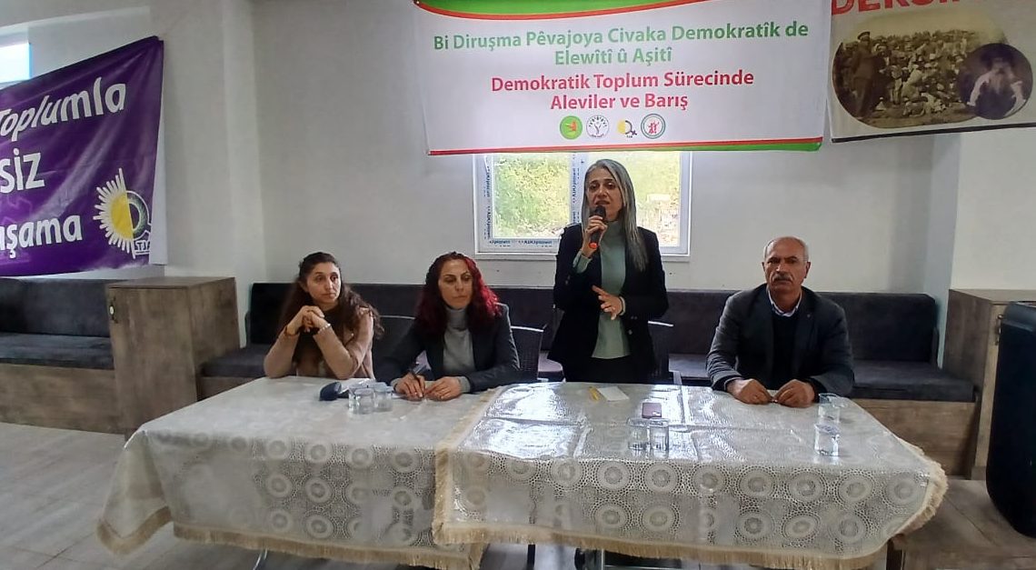 PİRHA- DBP Eş Genel Başkanı Çiğdem Kılıçgün Uçar, ‘Demokratik Toplum Sürecinde Aleviler ve Barış’ başlıklı toplantıda konuştu. Çiğdem Kılıçgün Uçar, ülkenin kurucu öznesi olan Aleviler ve Kürtlerin inkâr döneminden geçtiğini vurgulayarak, “Süreci sahiplenmek kendi inancımızı, kimliğimizi sahiplenmektir” dedi.