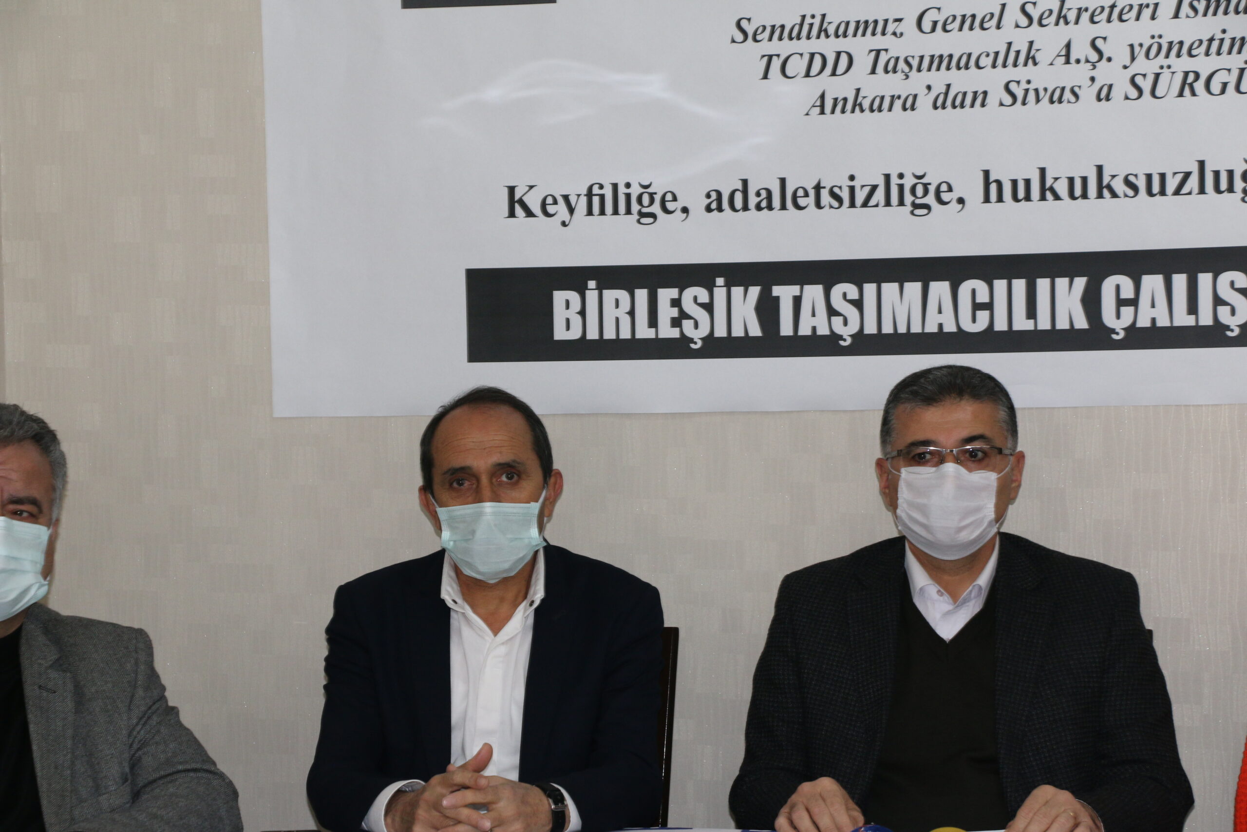 BTS Genel Merkezinde yapılan toplantı salonuna “Çin Tören Treni Meğerki Sürgün Taşıyormuş! Sendikamız Genel Sekreteri İsmail Özdemir, TCDD Taşımacılık A.Ş. yönetimi tarafından Ankara’dan Sivas’a sürgün edildi. Keyfiliğe, adaletsizliğe, hukuksuzluğa sessiz kalmayacağız” pankartı asıldı.