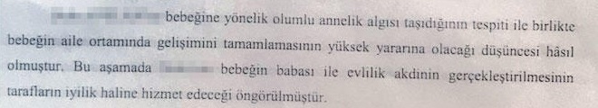 “Bu durum gerek Ş.A.’nın kurum bakım sürecinde kurduğumuz ilişkiye gerekse bebeğin gelişimine olumsuz anlamda etkide bulunmuştur. Bu durumun gerek gencimizin ruhi sürecine olumsuz etkilerine gerekse bebeğin ebeveyn yoksunluğu ile büyümesine yol açmasının kaçınılmaz oluşu göz önünde bulundurulduğundan evlilik akdinin tarafların iyilik haline katkı sağlayacağı kanaati oluşmuştur.”