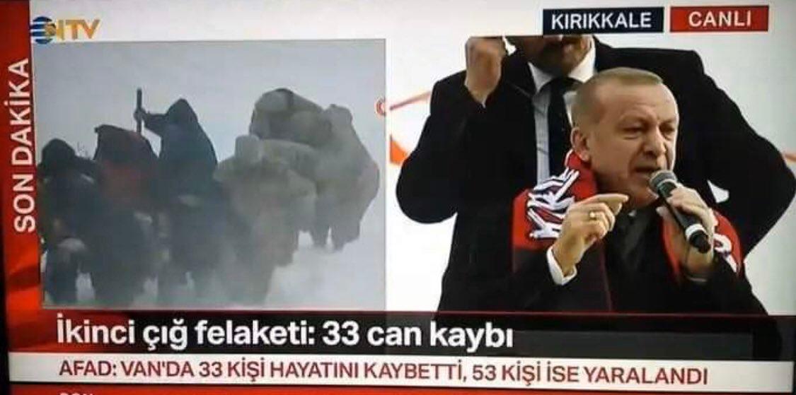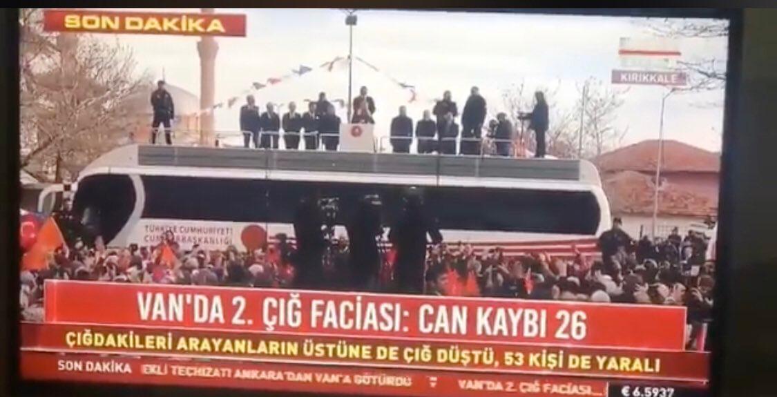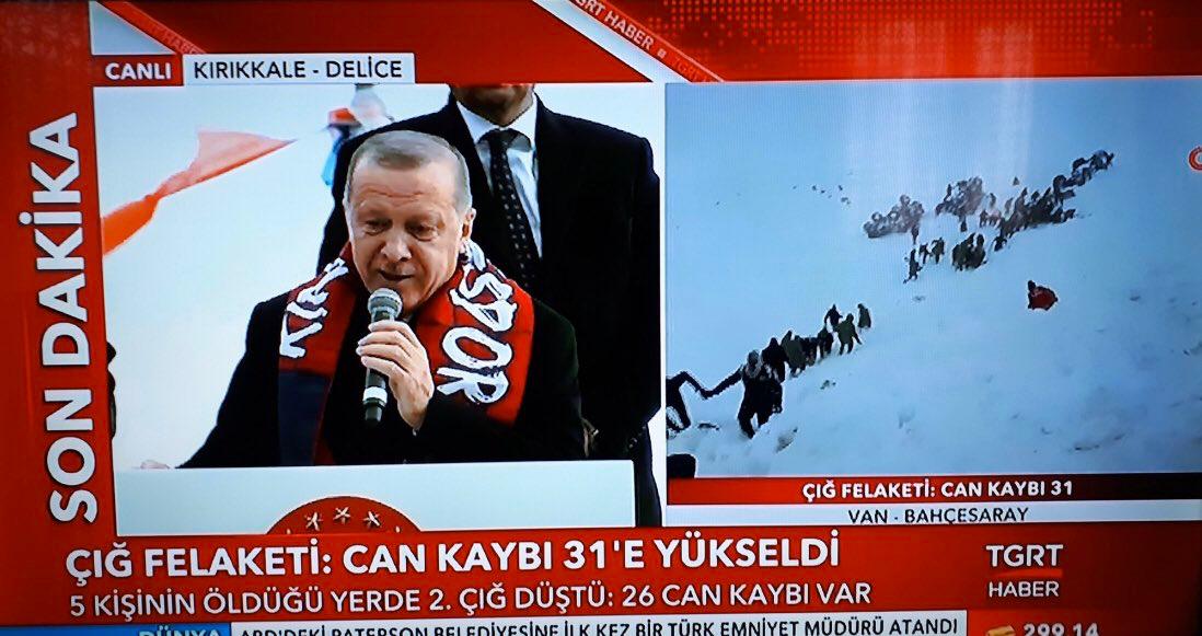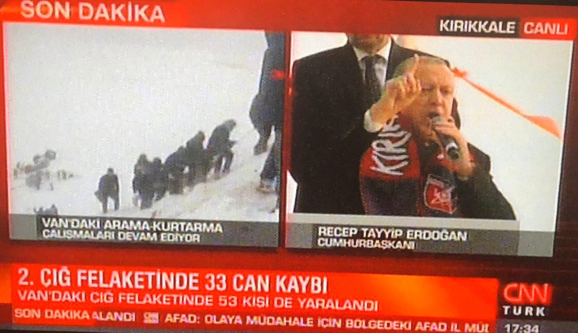 CNN Türk ve birçok kanal, Erdoğan’ın Kırıkkale’de yaptığı mitingi, onlarca kişinin hayatını kaybettiği Van’daki çığ felaketinden daha önemli gördü. Çığ felaketiyle ilgili ilgili yayını kesen kanallar, Erdoğan’ın mitingini canlı yayınla verdi.