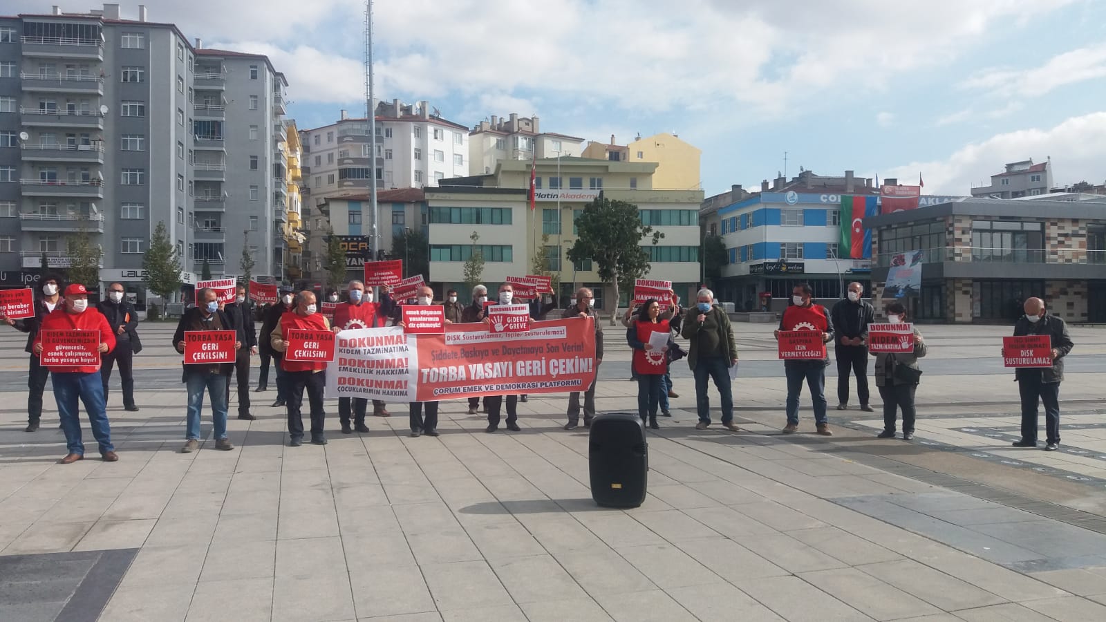 Kadeş Barış Meydanı’nda düzenlenen kitlesel basın açıklamasına Çorum Emek ve Demokrasi Platformu bileşenleri temsilcileri, CHP İl Sekreteri Aydın Taşkın, CHP Merkez İlçe Başkanı Ulaş Tokgöz, EMEK Partisi Merkez İlçe Başkanı Hıdır Aygün, HDP İl Başkanı Şeref Karataş, Atatürkçü Düşünce Derneği (ADD) Şube Başkanı Uğur Demirer ve CHP Kadın Kolları İl Başkanı Kamile Anar ile çok sayıda vatandaş katıldı.