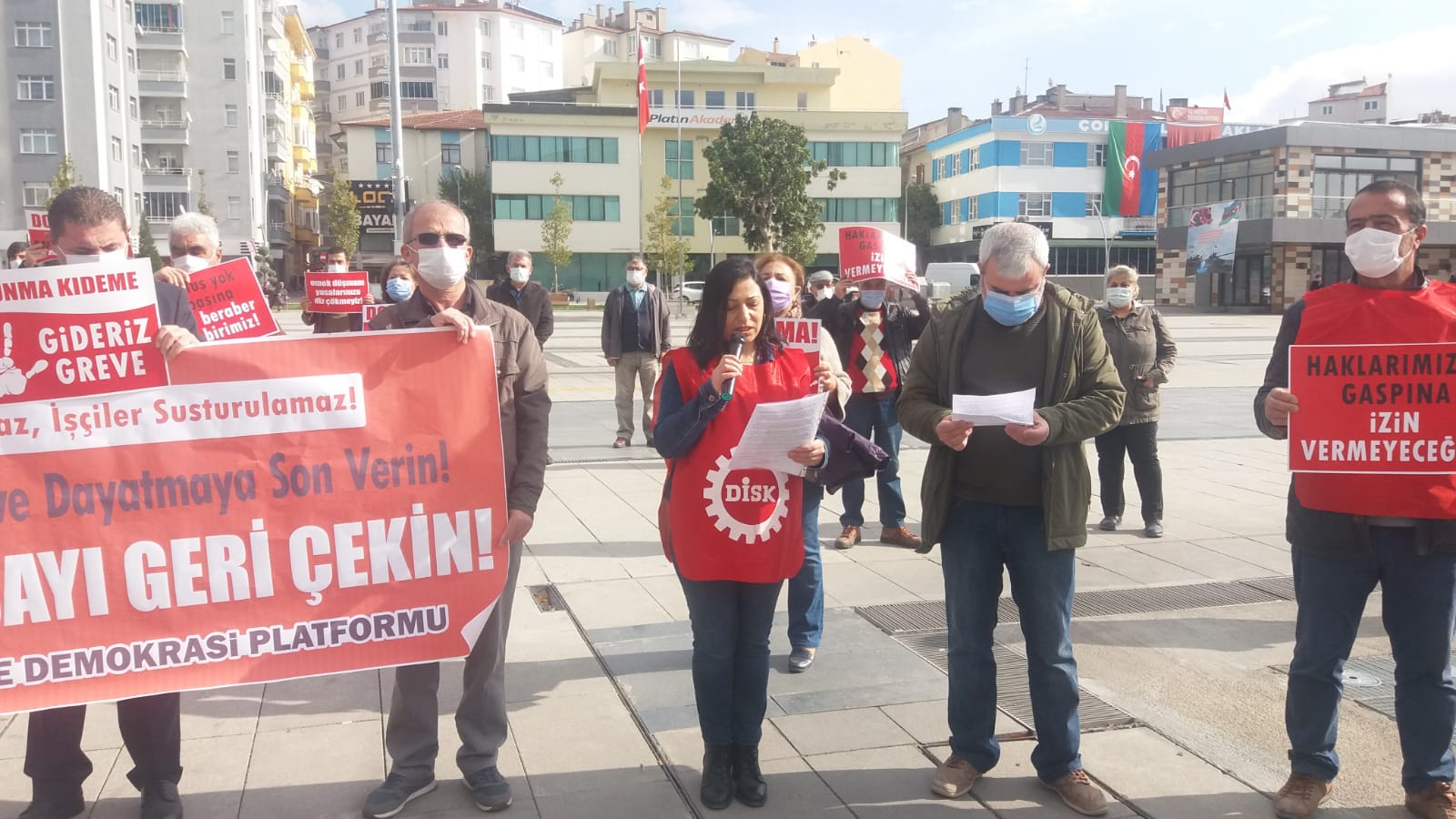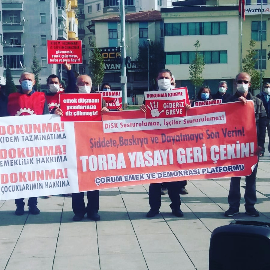 Kıdem tazminatımızı ve emeklilik hakkımızı torbaya atıp çalmak isteyenler, aynı torbadan işverenlere bol bol destek ve teşvik dağıtıyor. İşsizlik Sigortası Fonu kaynakları yağmalanmak isteniyor. Pandemi koşullarında yaşam ve geçim savaşı veren biz işçileriz. İşsiz ve aşsız kalan biz işçileriz. Ücretsiz izin adı altında açlığa mahkûm edilen yine biz işçileriz. Bize ait İşsizlik Sigortası Fonundan bol keseden destek alanlar ise patronlar. Adaletiniz batsın! Düzeniniz batsın! İktidarın meclise getirdiği torba öyle bir torba ki adaletsizlik dolu. Kayıt dışı işçi çalıştıran işveren mevcut yasalarımıza göre suç işlemektedir. Ancak meclisteki yeni yasaya göre işveren suçunu kabul etmesi durumunda af edilmekte, üstüne üslük prim teşviki ile ödüllendirmektedir. Kıdem tazminatı ve emeklilik hakkı bize çocuklarımızın emanetidir ve çocuklarımızın bu hakkını savunmak tüm işçi sınıfının görevidir. Evet, tüm işçilerin 25 yaş altında çalışacak çocukları olacak ve bugünün genç işçileri de bir gün 50 yaşına gelecek. Buradan iktidarı bir kez daha uyarıyoruz: Çocuklarımızın emanetinin ve geleceğimizin gasp edilmesine sessiz kalmayacağız.”