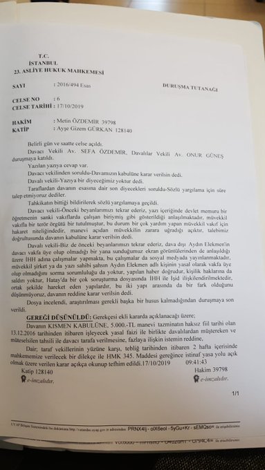 İstanbul Başakşehir’de bulunan TOKİ Osmangazi İlköğretim Okulu’nda görevli Aydın Erekmen isimli öğretmenin İnsani Yardım Vakfı (İHH) ile olan bağlantısını ortaya çıkardığı, öğrencilerinin eline idam ipi vererek fotoğraf çektirmesini ve bunları da sosyal medya hesabı üzerinden paylaşmasını haberleştiren gazeteci Tuğba Özer hakkında İHH tarafından açılan davada mahkeme heyeti, Özer’e 5 bin TL para cezası verdi.