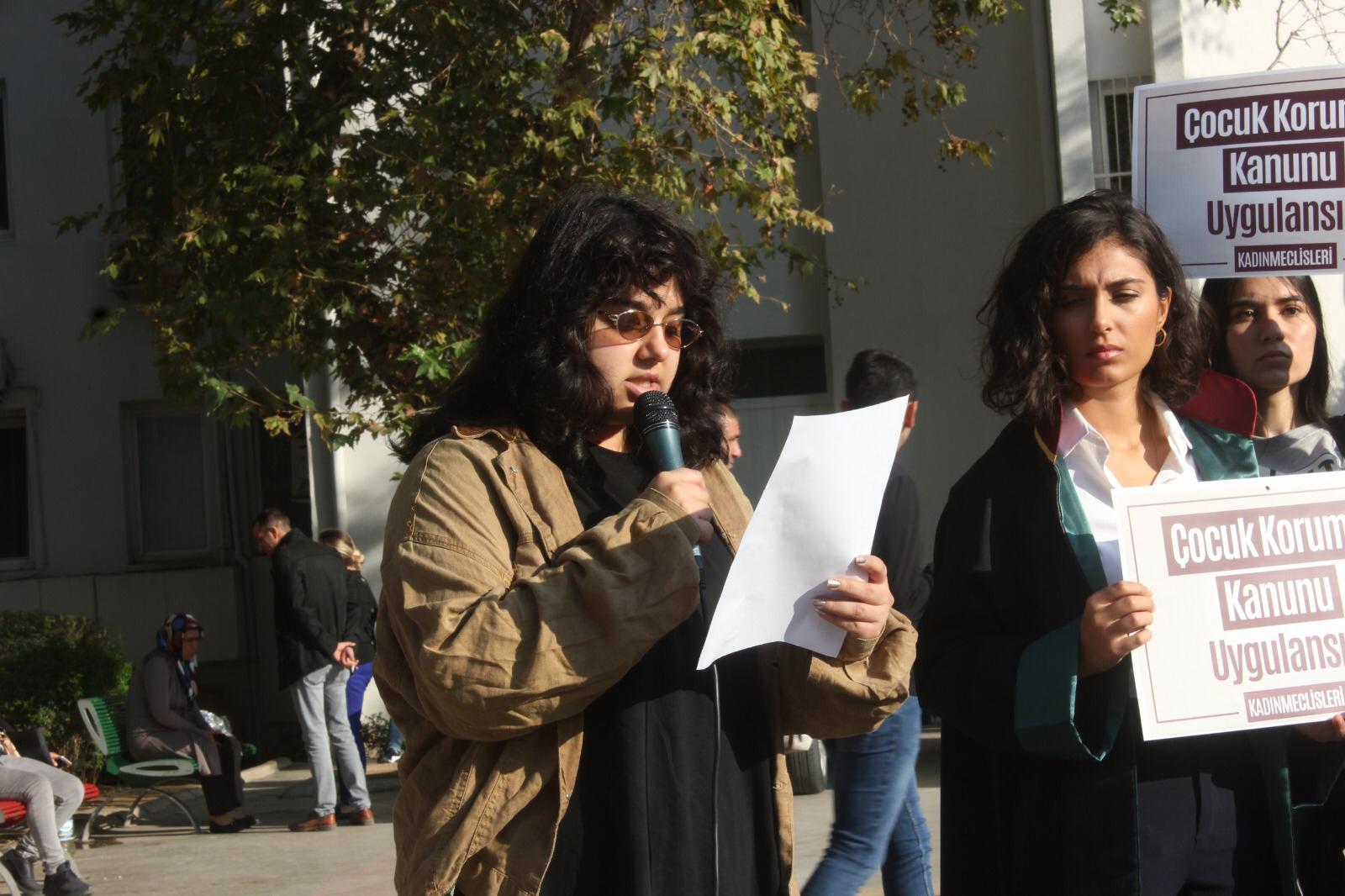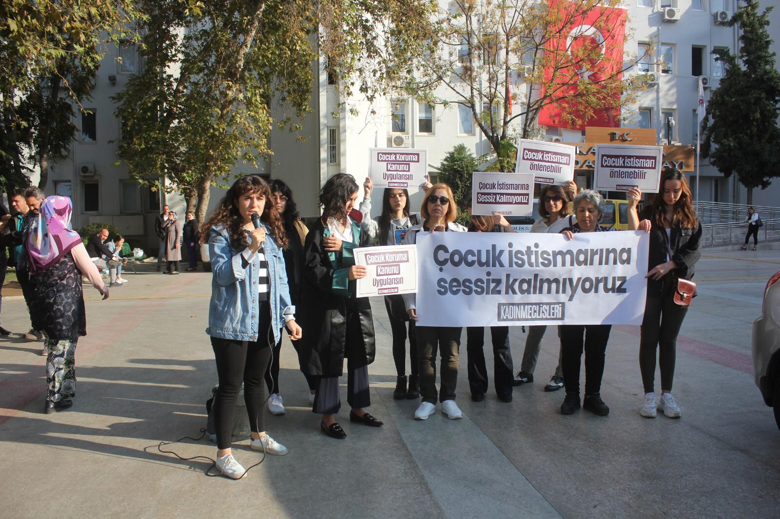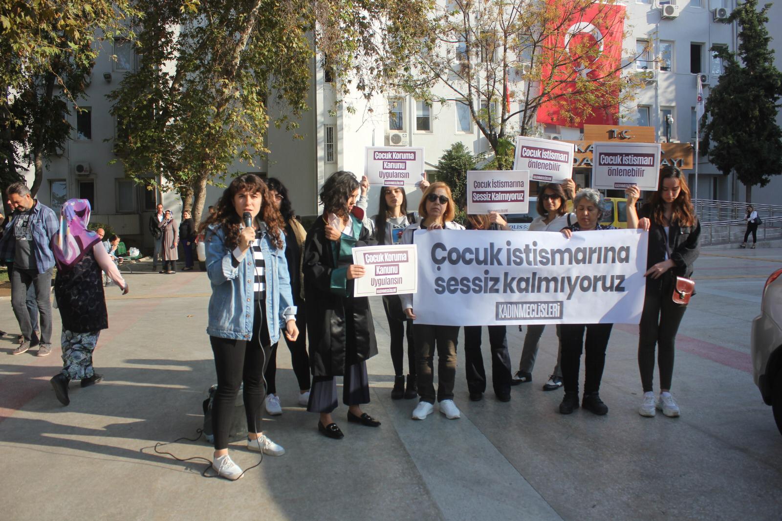 Dava öncesinde İzmir Kadın Meclisleri Karşıyaka Adliyesi önünde basın açıklaması düzenledi. Basın açıklamasını okuyan Beyza Tunç fail erkeğin dava edildiğinden bu yana tutuksuz yargılandığını hatırlatarak “Sanık, işi gereği küçük çocuklarla çalışıyor. Soruyoruz; sanığın tutuklu yargılanması için kaç çocuğun daha istismara uğraması gerek? Yasa uygulayıcılara sesleniyoruz: Adaleti erteleyemezsiniz. Sanık öncelikle tutuklu yargılanmalı ve bir an evvel hak ettiği cezayı almalıdır” dedi.