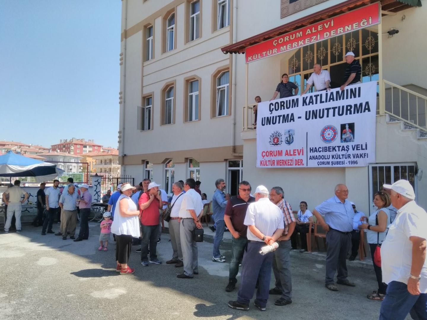 PİRHA – Dün Sivas katliamını protesto ve katliamda yaşamını yitirenleri anmak için Sivas’ta adalet arayışında bulunan Alevi toplumu bu gün de Çorum katliamında yaşamını yitirenleri anmak için Çorum’da bir araya geldi. Hacı Bektaş Veli Anadolu Kültür Vakfı Çorum Şubesi önünde biriken kitle anma etkinliğinin başlaması için beklemesini sürdürüyor.