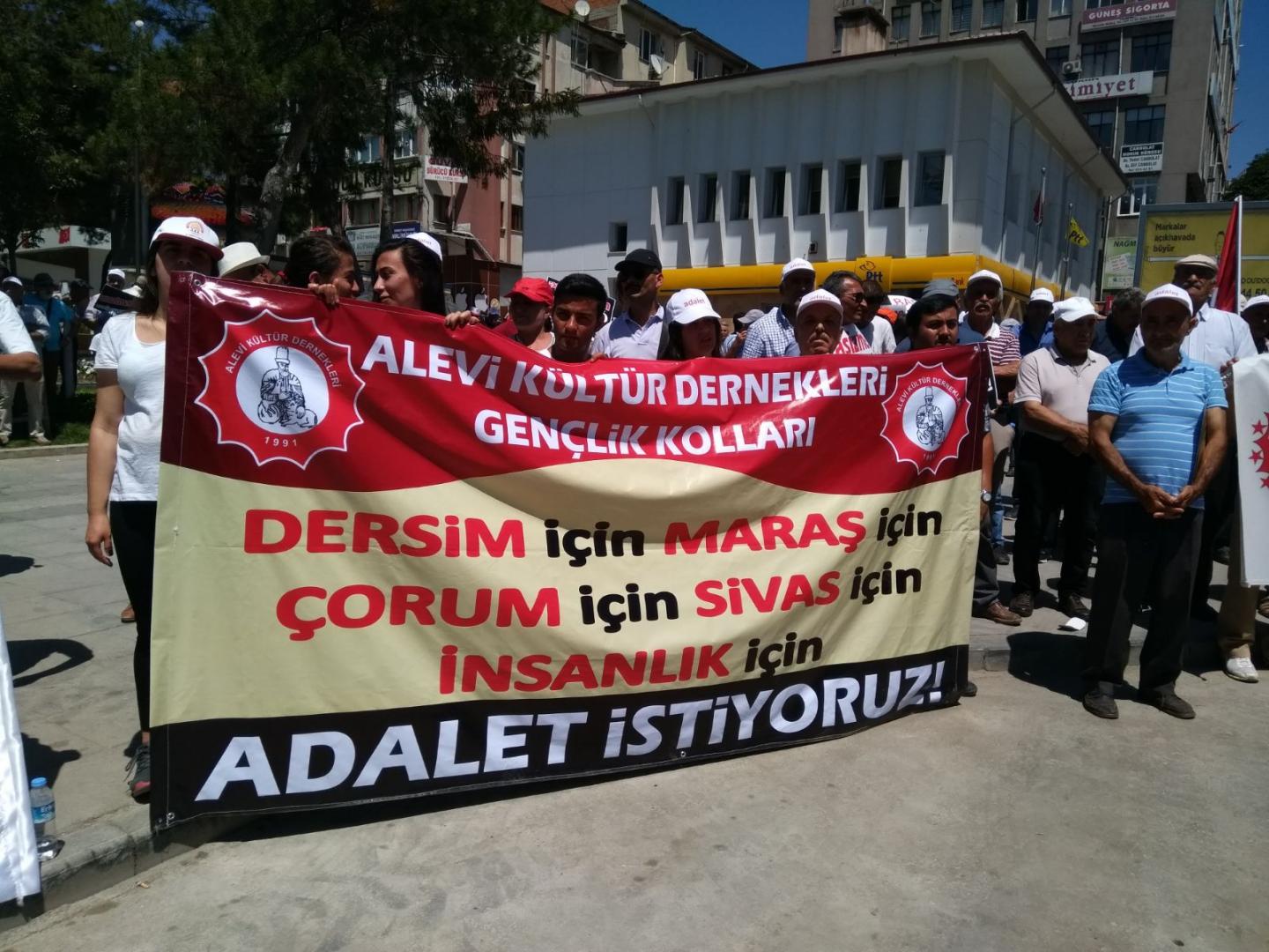 PİRHA – Sivas katliamını protesto etmek ve katliamda yaşamını yitirenleri anmak için dün Sivas’ta adalet arayışında bulunan Alevi toplumu bugün de Çorum Katliamı’nda yaşamını yitirenleri anmak için Çorum’da bir araya geldi. Hacı Bektaş Veli Anadolu Kültür Vakfı Çorum Şubesi önünde toplanan kitle, Salı Pazarı’na doğru yürüdükten sonra Saat Kulesi’ne vardı. Burada anmada yapılan konuşmalarda Adalet Yürüyüşü’nün önemine dikkat çekildi.