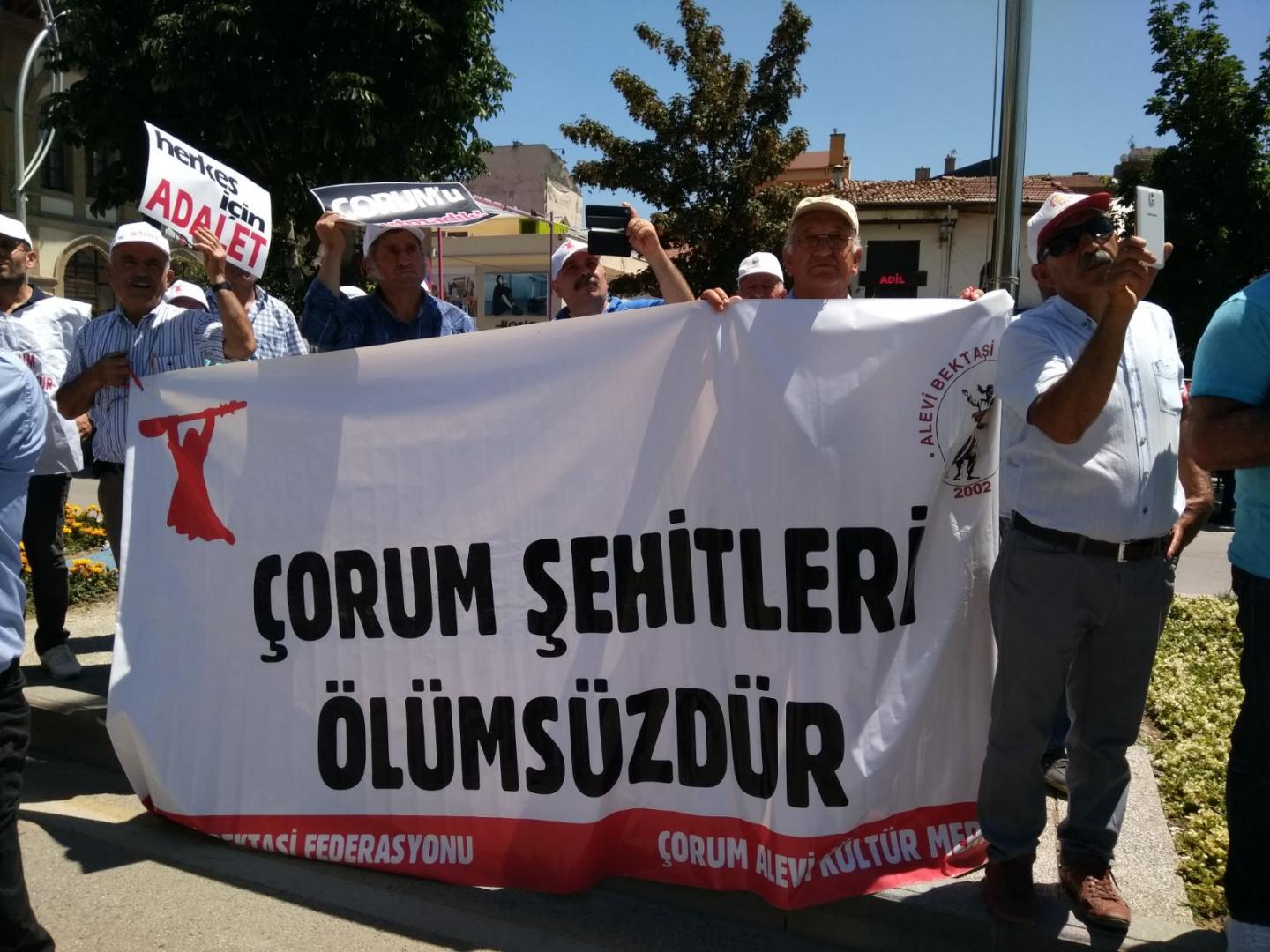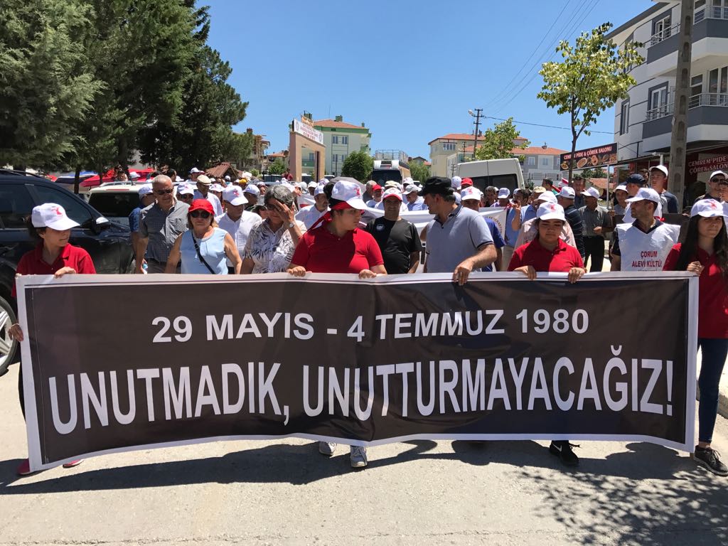 Yürüyüşte “Biz Aleviler barış ve eşit yurttaşlık talebimizi her ortamda istemekten vazgeçmeyeceğiz ifadeleri kullanıldı. Kitle tarafından sık sık “Çorum’u unutmak ihanettir, zulümdür” sloganları atıldı.
