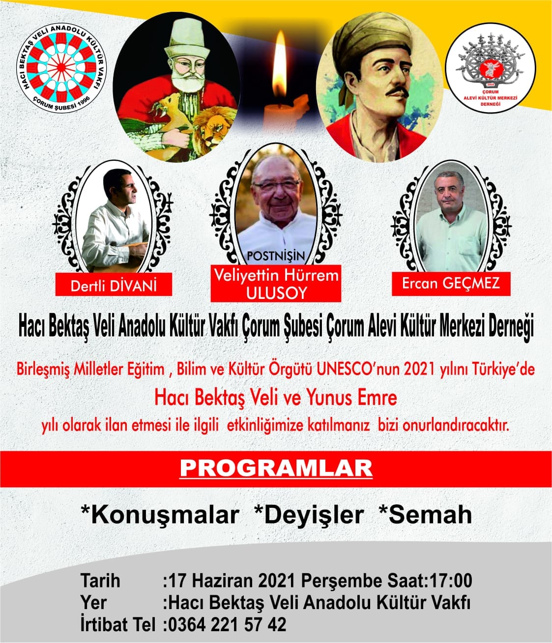 Hacı Bektaş Veli Anadolu Kültür Vakfı ve Çorum Alevi Kültür Merkezi Derneği, UNESCO’nun 2021 yılını Türkiye’de Hacı Bektaş Veli ve Yunus Emre yılı olarak ilan etmesi ile ilgili 17 Haziran Perşembe günü saat 17.00’de etkinlik düzenledi.