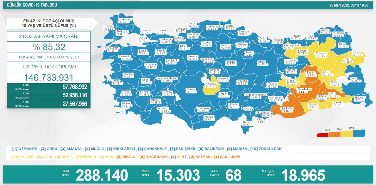 Sağlık Bakanlığı’nın açıkladığı güncel Covid-19 verilerine göre son 24 saatte 288 bin 140 test yapılırken, 15 bin 303 yeni vaka tespit edildi. 68 kişi ise salgın nedeniyle hayatını kaybetti. 18 bin 965 kişinin ise sağlığına kavuştuğu bildirildi.