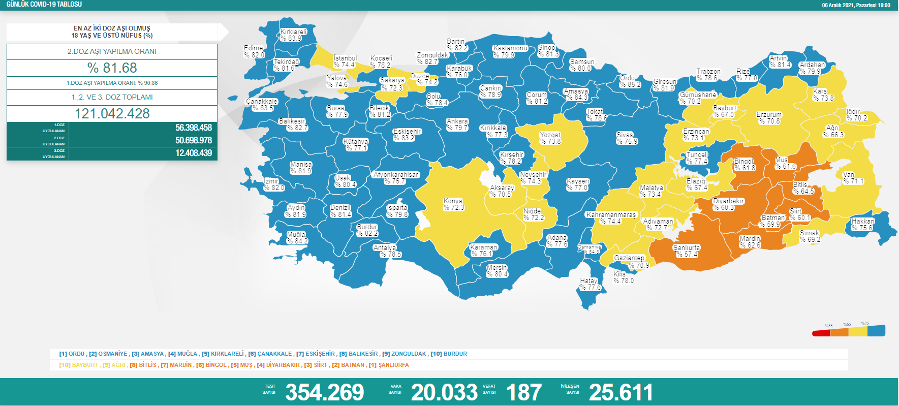 Sağlık Bakanlığı güncel koronavirüs verilerini açıkladı. Buna göre son 24 saatte 354 bin 269 koronavirüs testi yapılırken, 20 bin 33 yeni vaka tespit edildi. Salgın nedeniyle 187 kişi hayatını kaybetti. 25 bin 611 kişinin ise sağlığına kavuştuğu belirtildi.