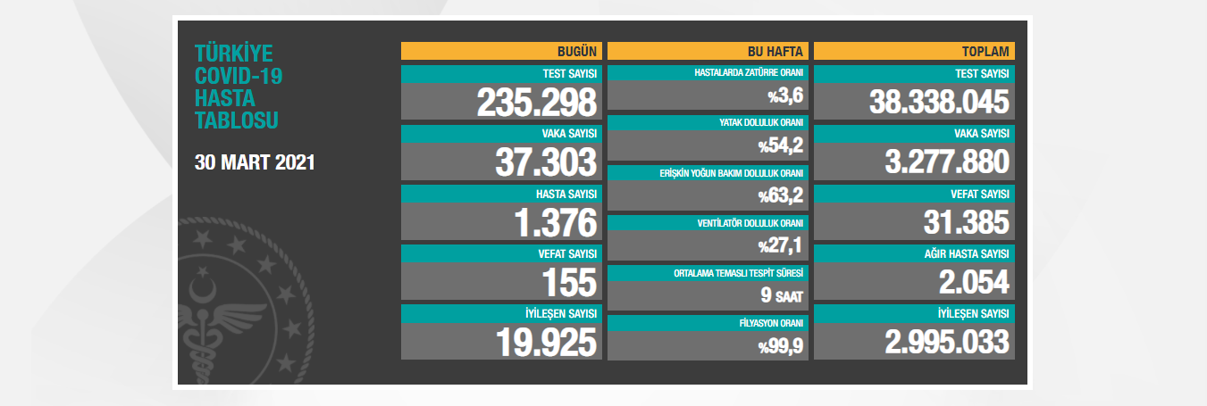 Sağlık Bakanlığı, koronavirüs (Kovid-19) günlük hasta tablosunu paylaştı. Verilere göre, Türkiye’de koronavirüs nedeniyle son 24 saatte 155 kişi daha hayatını kaybetti, bin 376 yeni hasta dahil olmak üzere 37 bin 303 yeni vaka tespit edildi.