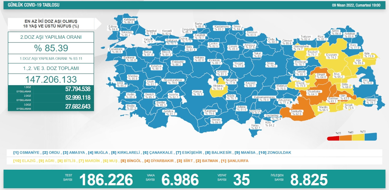 Sağlık Bakanlığı’nın açıkladığı 9 Nisan koronavirüs verilerine göre son 24 saatte 186 bin 226 test yapılırken, 6 bin 986 yeni vaka tespit edildi. 35 kişinin ise hayatını kaybetti. 8 bin 825 kişinin de sağlığına kavuştuğu bildirildi.