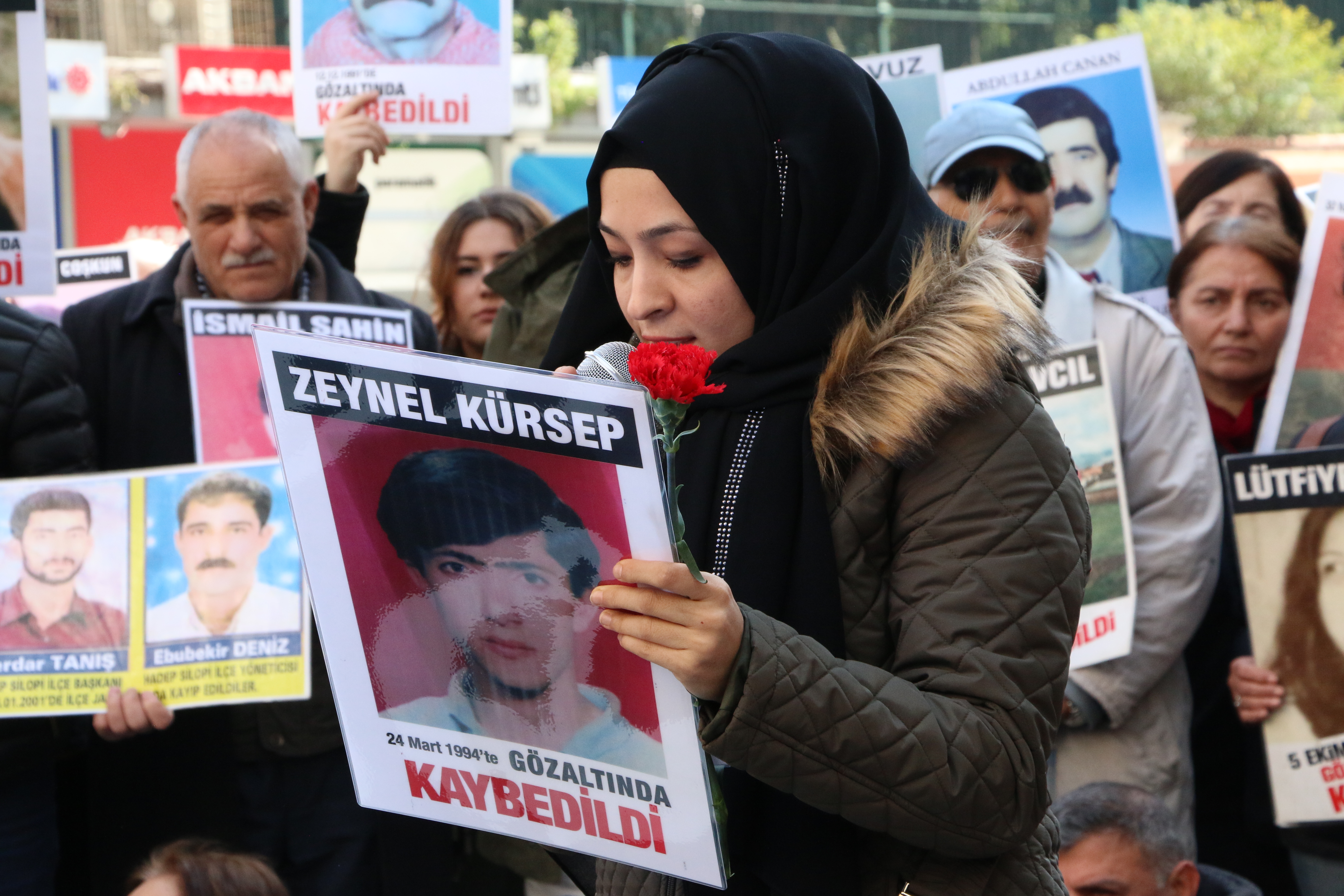 Basın açıklamasını Cumartesi İnsanlarından Serpil Taşkaya okudu. Taşkaya, “Bu topraklarda yüzlerce kişi zorla kaybedildi. Kaybedilmelerin büyük çoğunluğu devlet görevlileri tarafından gerçekleştirilse de; 90’lı yıllarda bazı aşiretlere gözaltına alma ve sorgulama yetkisi verildi. İnsanların Hizbullah tarafından kaçırılarak vahşi yöntemlerle sorgulanmasına devlet tarafından göz yumuldu ve bu topraklar zorla kaybetme cehennemine dönüştürüldü” dedi.