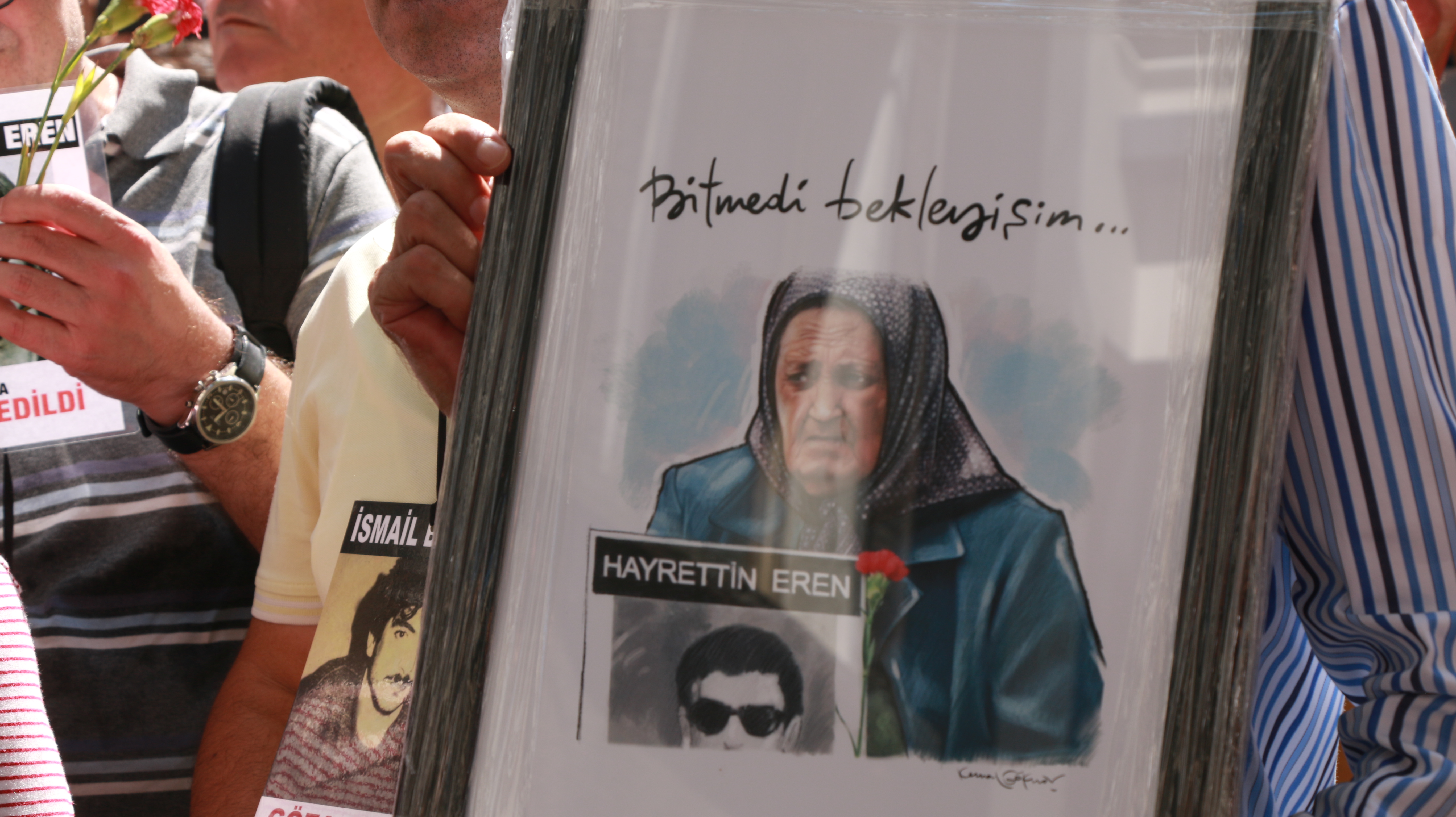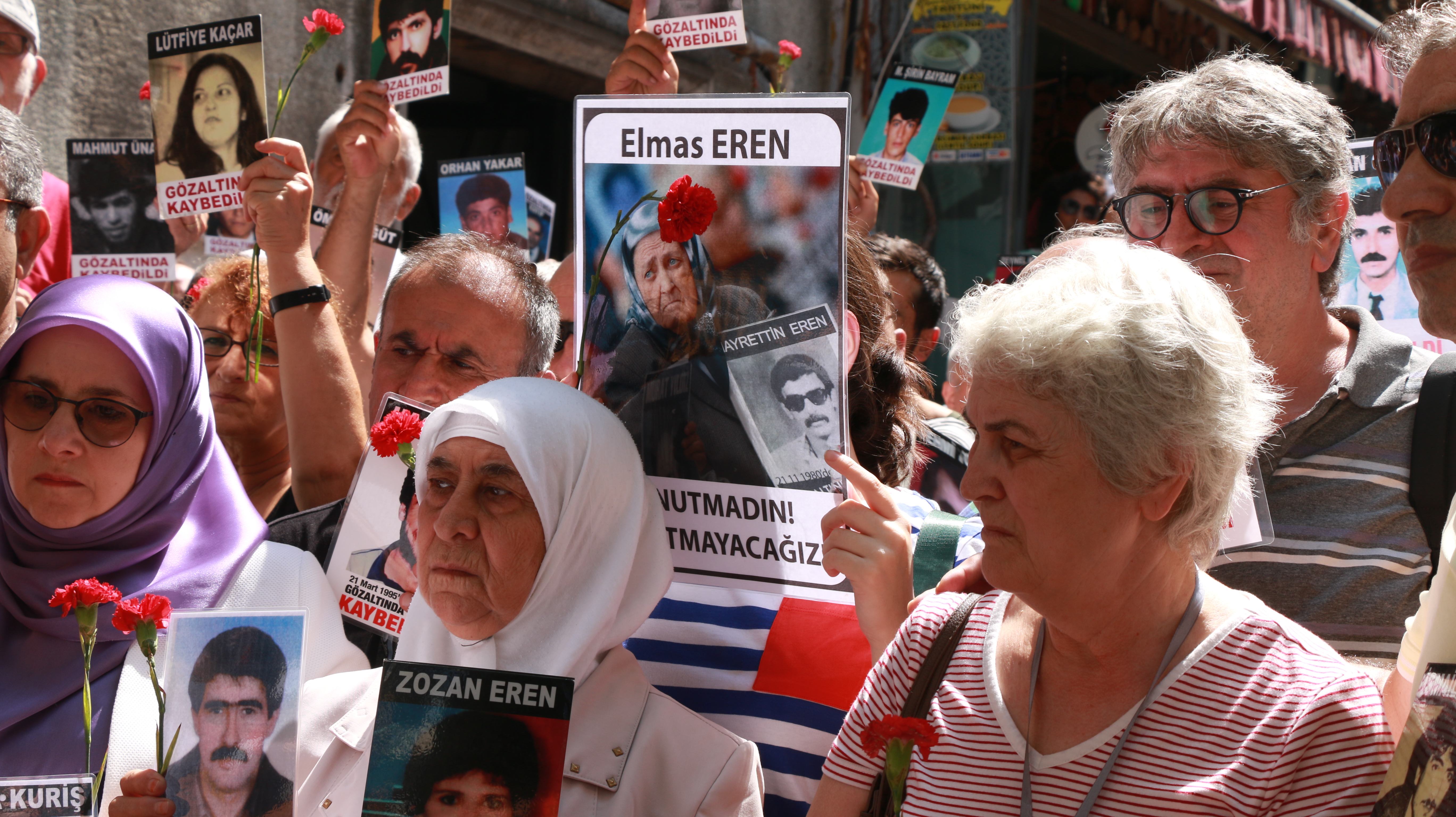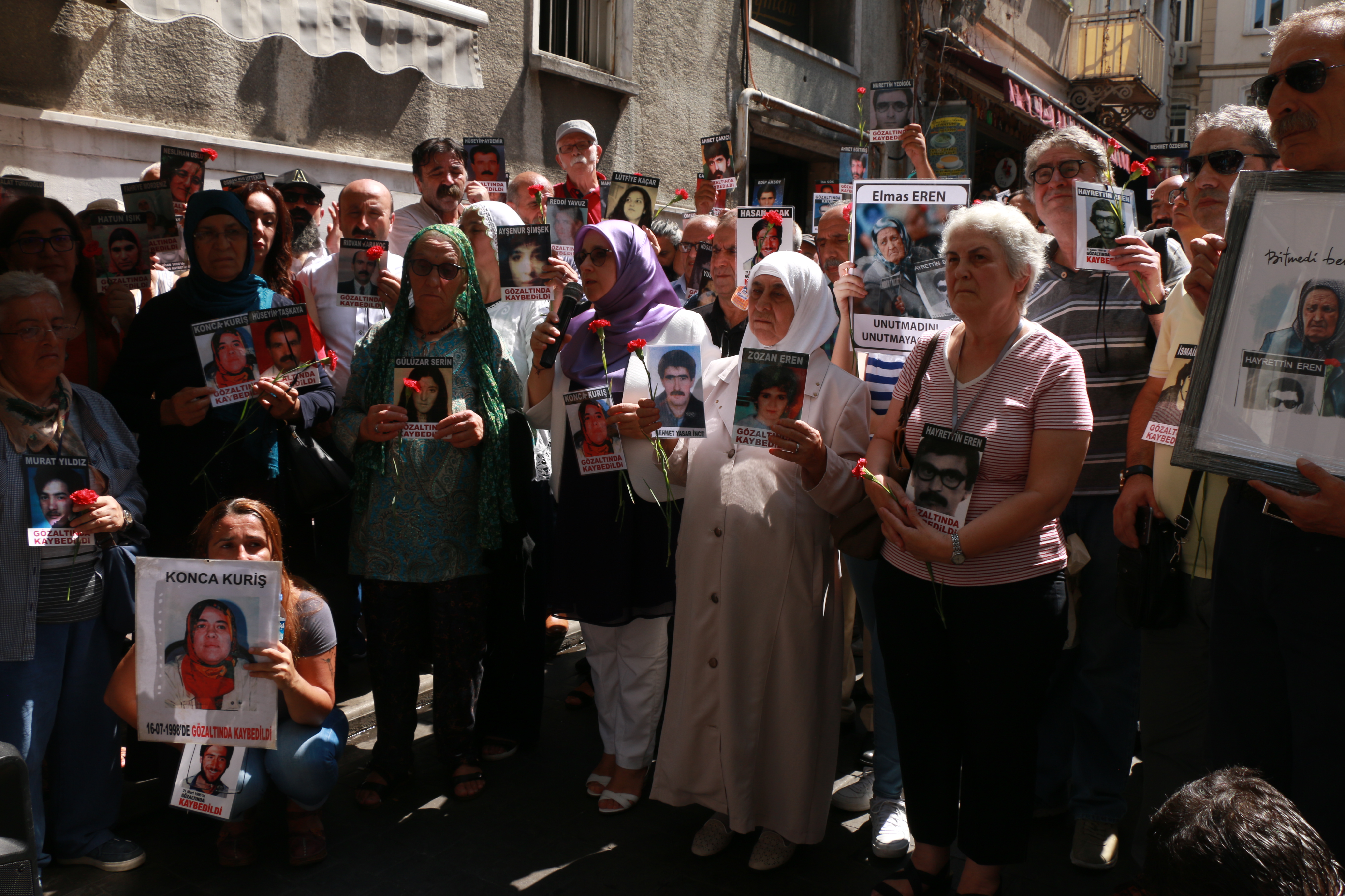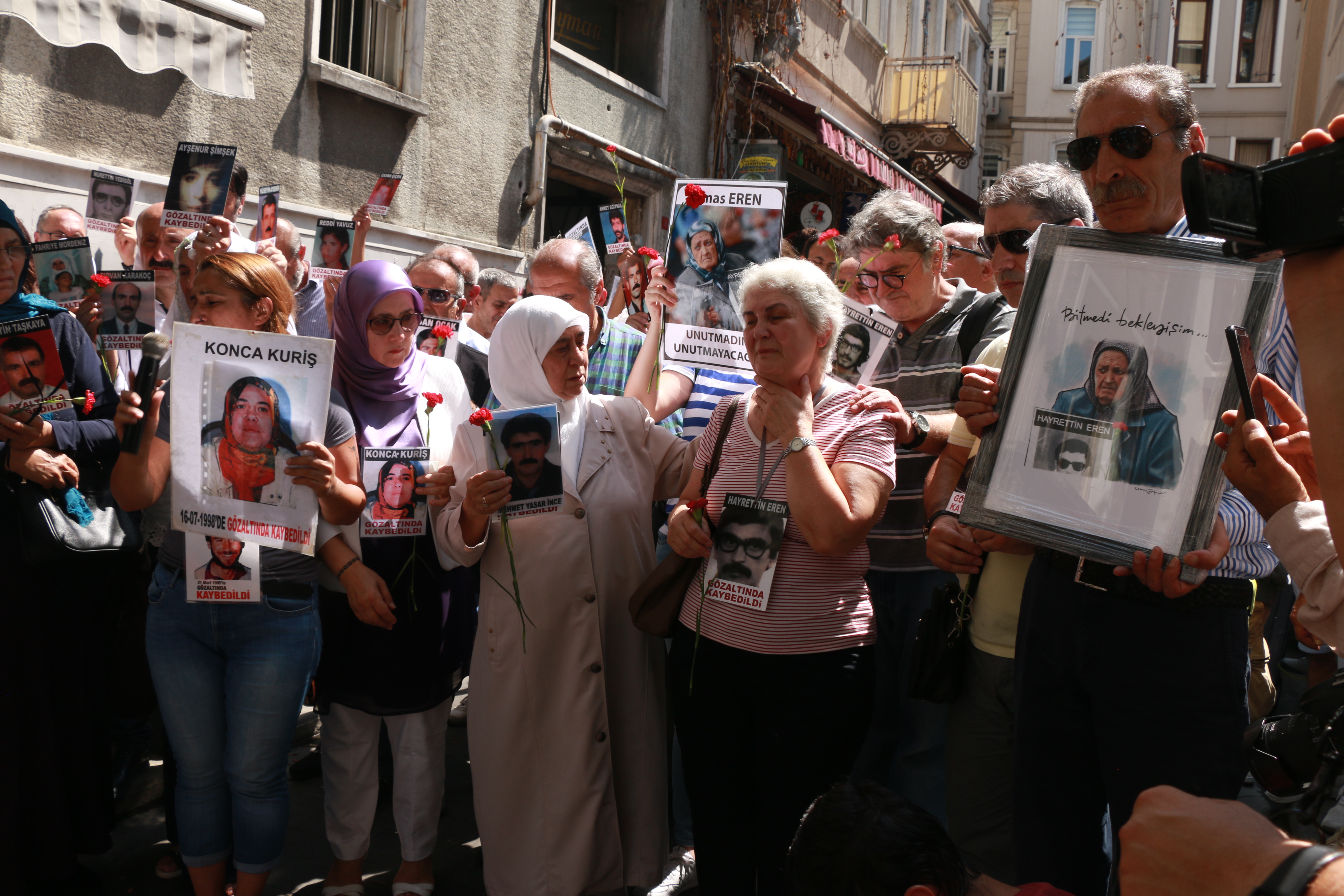 Cumartesi Annelerinin sembolü olan Galatasaray Meydanı’nın yasaklanması üzerinden tam bir yıl geçti. Cumartesi Anneleri bu haftaki eylemini de İnsan Hakları Derneği (İHD) İstanbul Şubesi’nin bulunduğu sokakta gerçekleştirdi. Açıklamada geçtiğimiz gün hayatını kaybeden 39 yıldır oğlu Hayrettin Eren için mücadele veren Cumartesi Annesi Elmas Eren de anıldı.