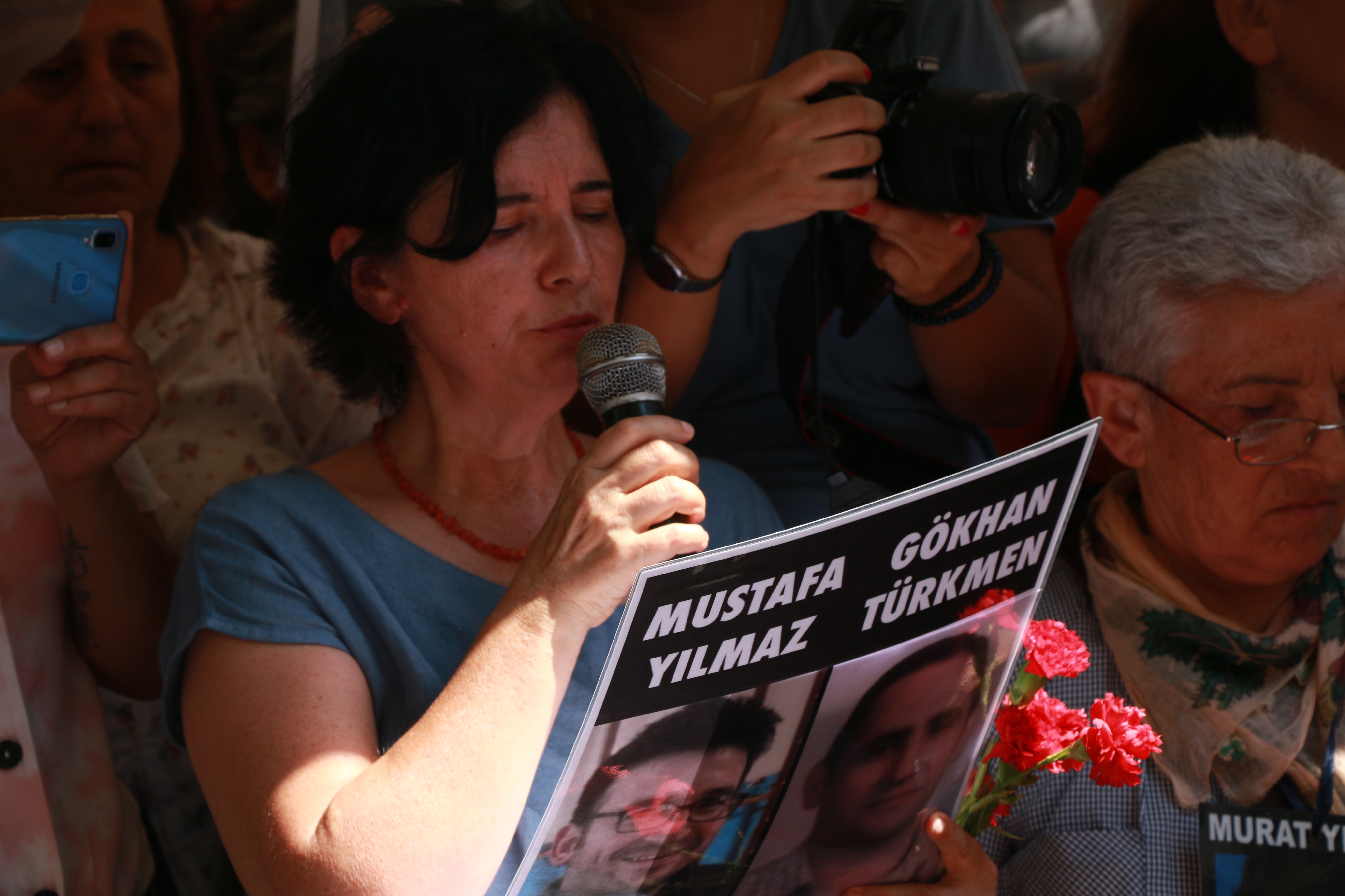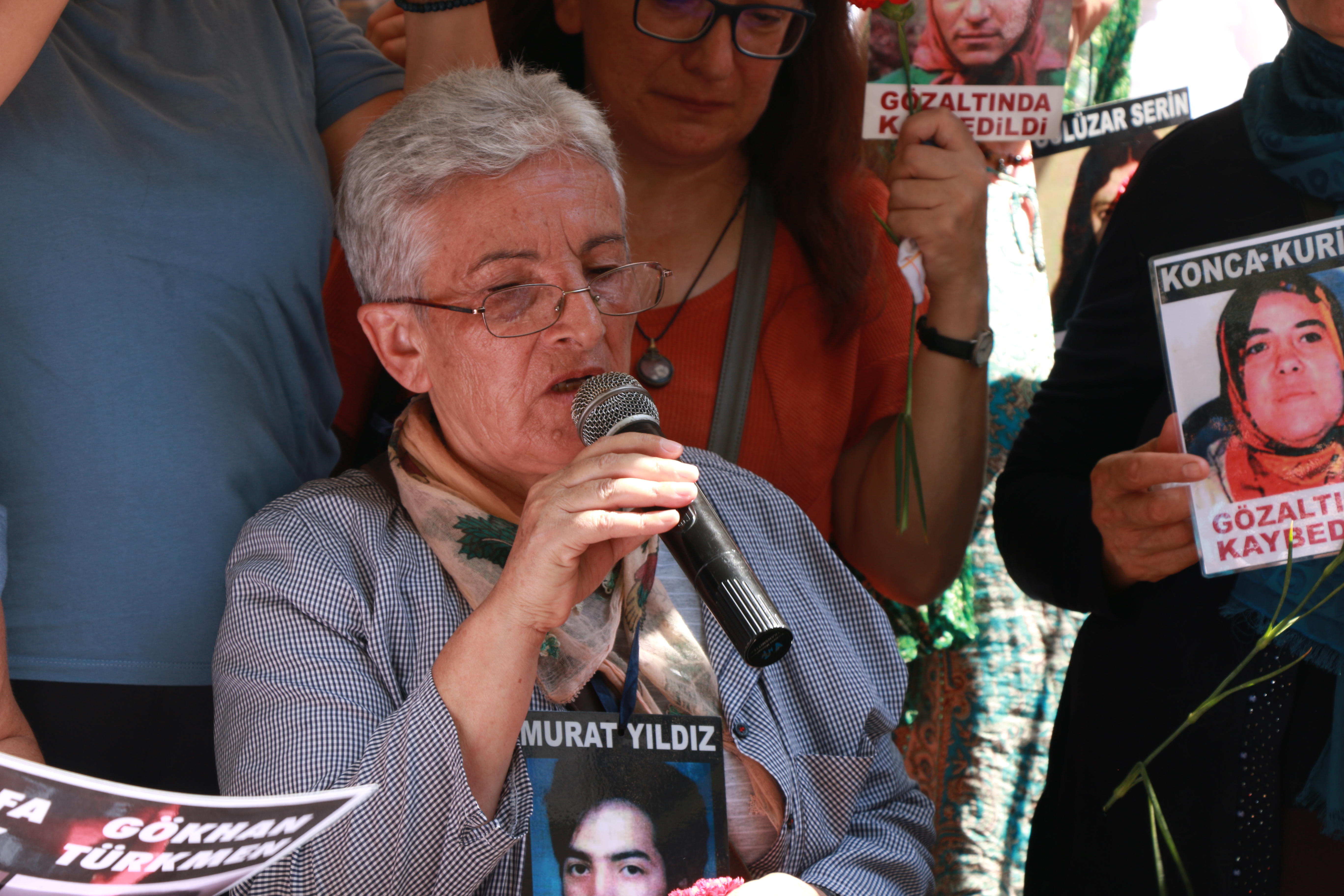 “Annemin beş evladı vardı. Annem devletine çok güveniyordu ama 1980’de annemin bir evladını devlet çaldı. Annemin 80’den sonra hayatında başka bir dönüm vardı. O gün 47 yaşındaydı annem… O çok güvendiği devlet kapıları birer birer yüzüne kapandı. Annem 47 yaşından sonra bu ülkeyi tanıdı. Bize mücadeleyi öğretti. 1995’ten sonra Cumartesi Annesi oldu. Annem umudunu hiç yitirmedi. Mücadelesinden hiç vazgeçmedi. Biz buradan annelerimizi, babalarımızı bu şekilde uğurluyoruz. Berfo Anne, Kiraz Şahin… Devletten alacaklı olarak gittiler. Artık biz onların mücadelesinin devamıyız. Asla vazgeçmeyeceğiz.”