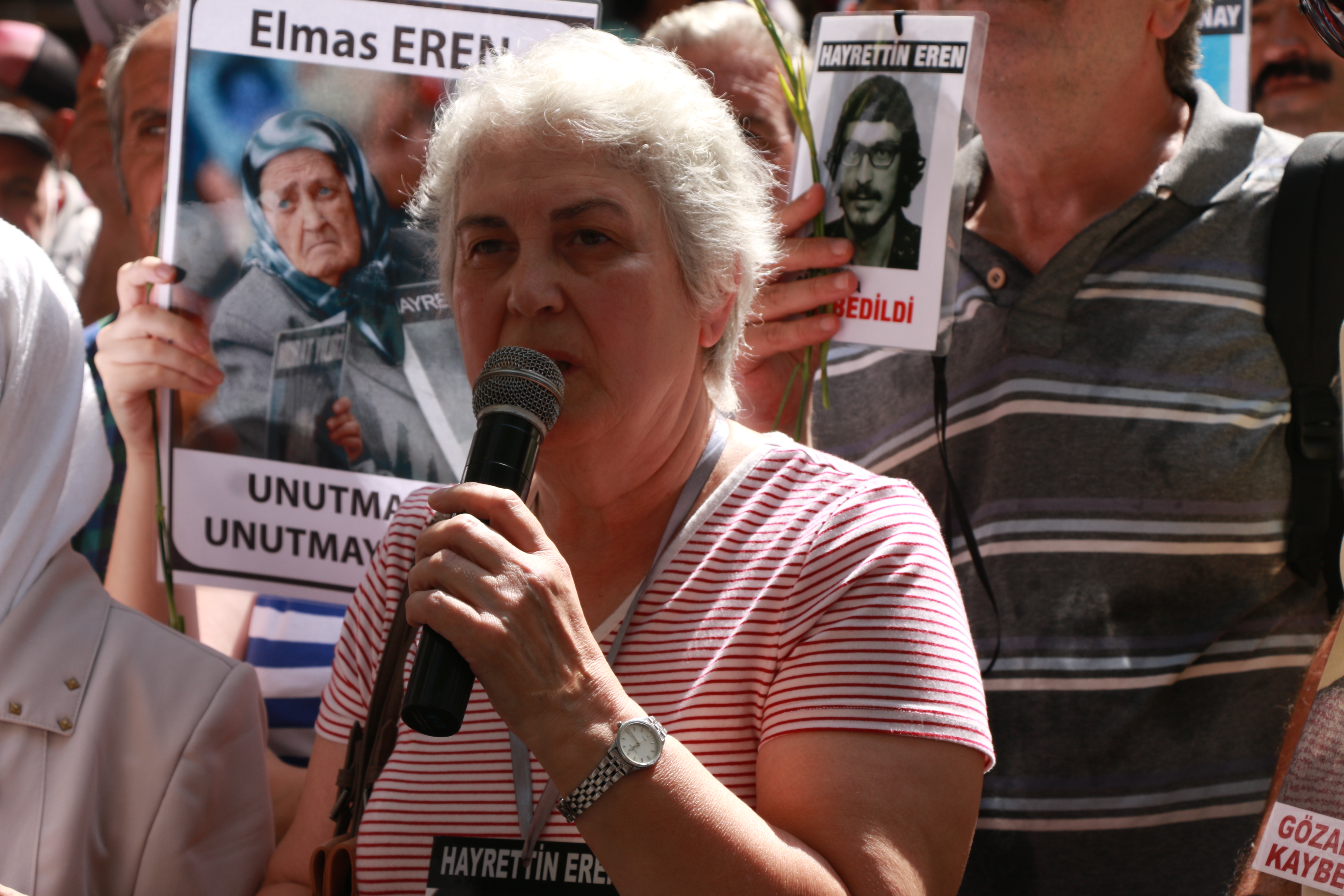 Daha sonra gözaltında kaybedilen Hasan Ocak’ın annesi Emine Ocak‘ın, yaşamını yitiren Elmas Eren için gönderdiği mesaj okundu. Ocak mesajında, “Çocuklarım, kardeşlerim, arkadaşlarım. 24 yıldır acımızla birlikte baş etmeye çalıştığımız, birlikte ağladığımız, adaletin sağlanması için yan yana diz çürüttüğümüz yoldaşım Elmas’ın ardından, bugün yanınızda olup birlikte ona uğurlar olsun demeyi isterdim. Sağlık sorunlarımdan dolayı aranızda değilim. Arkadaşım Elmas’ı kaybettiğimiz günden beri hiçbir yere sığamıyorum. Devleti yönetenler hesap vermemek için hepimizin ölmesini bekliyor ama bir gün mutlaka hesap verecekler. Çünkü biz anneler ölsek bile, çocuklarımız, torunlarımız ve mücadele arkadaşlarımız kayıplar bulunup, adalete ulaşıncaya kadar susmayacaklar. Gözün arkada kalmasın Elmas’ım, çocukların bana emanet. Rahat uyu Elmas’ım, Hayrettin’i son nefesim kadar unutturmayacağım. Elmas’ım, Bir yıldır bizim olan, kayıplarımızın olan meydana gidemiyoruz diye yüreğin parçalanıyordu ya. Sana söz o meydanda fotoğraflarımızı taşıyana kadar vazgeçmeyeceğim, vazgeçmeyeceğiz” dedi.