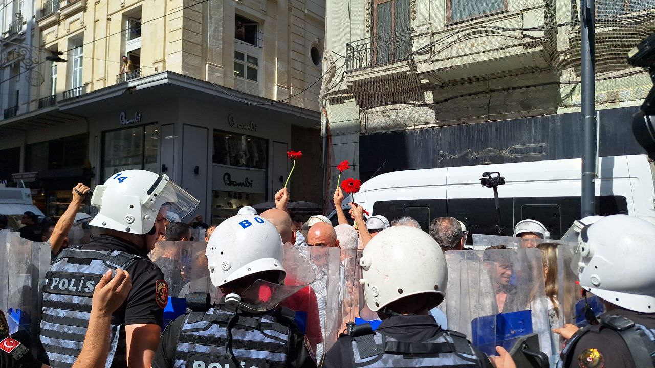 Anayasa Mahkemesi’nin (AYM) verdiği “ihlal” kararına rağmen 25 haftadır Galatasaray Meydanı’na girmeleri engellenen Cumartesi Anneleri/İnsanları’nın bu haftaki eylemi, yine Beyoğlu Kaymakamlığı’nın “yasak” kararı gerekçe gösterilerek engellendi. Beyoğlu Kaymakamlığı’nın “yasak” kararını gerekçe göstererek eyleme izin vermeyen polis, bu hafta da meydan ve meydana çıkan tüm ara sokakları saatler öncesinden bariyerlerle kapattı.